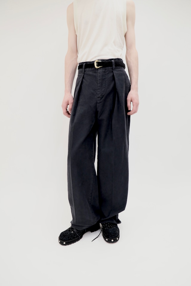 ------------------------- 高密度に織り上げた日本製オーガニックコットン・モールスキンを硫化染めし、ワイドトラウザーに仕立てました。製品洗いによって生まれるパッカリングと力強いフェードが、着込むほどに深まる表情を形成します。 ワイドシルエット、六角ベルトループ、深い1タック、センタープレス。 ------------------------- COTTON 100% ------------------------- SIZE 2 ウエスト 76cm ワタリ 36.3cm 股下 80cm 股上 34.3cm 裾巾 25.5cm SIZE 3 ウエスト80cm ワタリ 37.5cm 股下 82cm 股上 34.8cm 裾巾 26.5cm ------------------------- ※サイズ表記について、各商品ごとに誤差が生じる場合があります。あくまでも目安としてご参照ください。 ※硫化染めの特性上、摩擦・水濡れによる色移り/色落ちにご注意ください。 ※加工の性質上、色味やパッカリングには個体差があります。 ※原則として返品、交換は受け付けておりません。商品に不備があった場合のみ、交換対応をとらせていただきます。予めご了承ください。