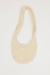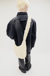 国内に1台しかない貴重な経編機で一目ずつゆっくりと編み込まれた1ゲージのウール糸と、テープ上の極広ナイロン糸を編み合わせ、モコモコのハンドニットバッグを作りました。