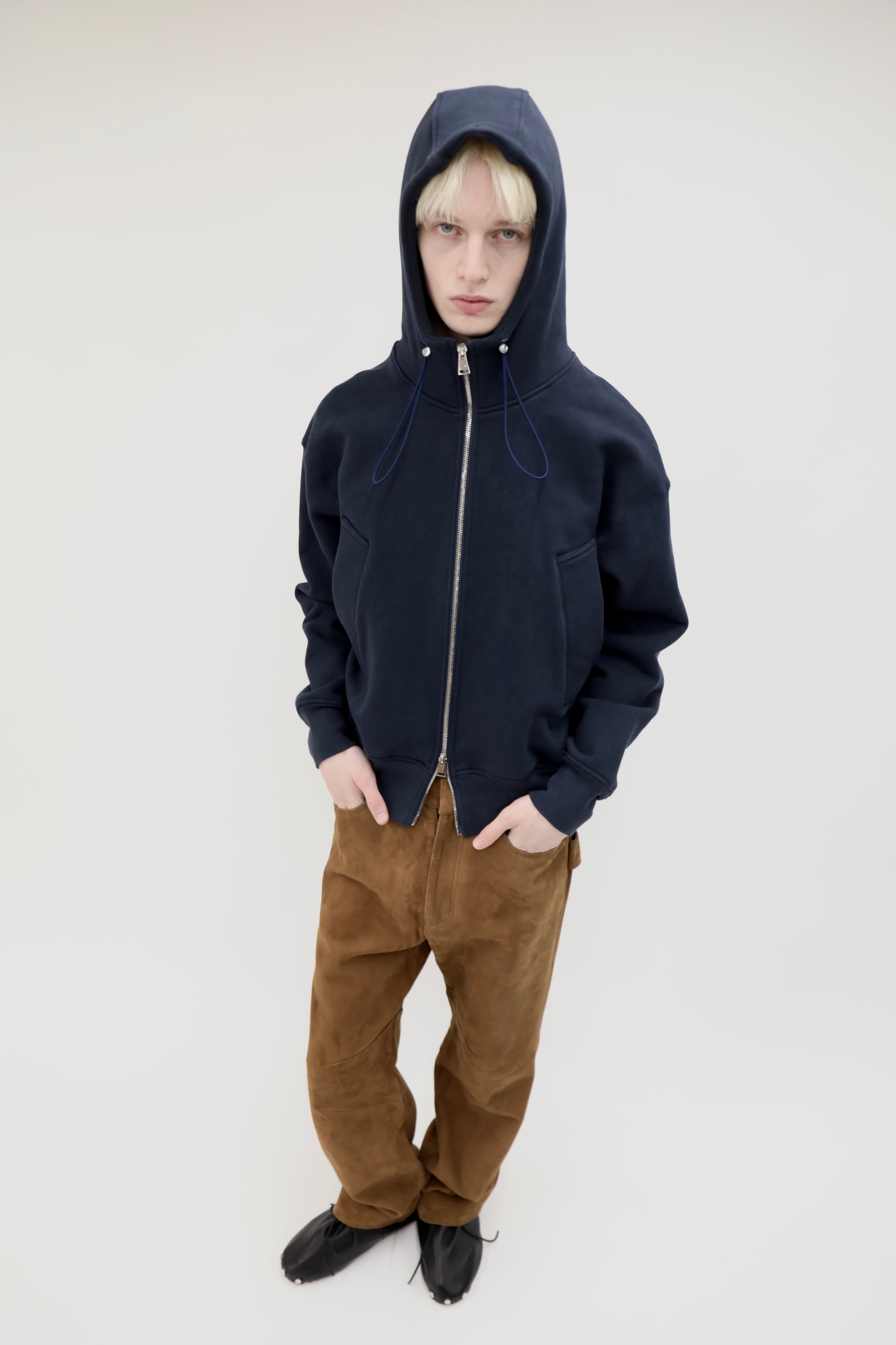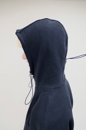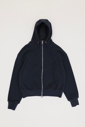 全方位にストレッチ性を持たせた驚くほどモチモチのスーパーヘビースウェットを、スペーシーなジップアップフーディに仕立てました。裏毛生地でありながらポケットやフーディは布帛で採用される仕様のため、掴み所のない雰囲気に仕上がっています。