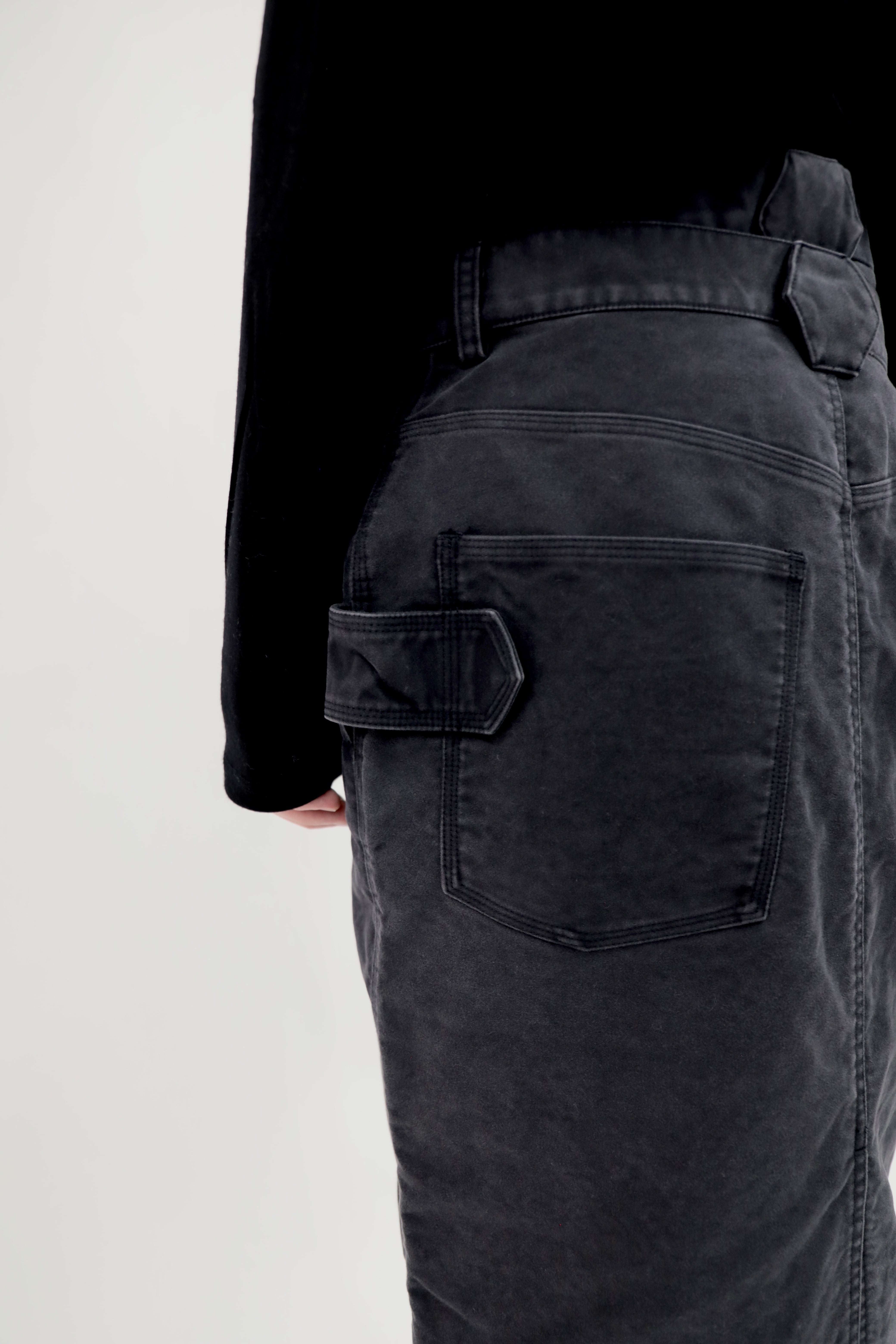 高密度に織り上げた日本製オーガニックコットン・モールスキンを硫化染めし、コンサバティブなスカートに仕立てました。製品洗いによって生まれるパッカリングと力強いフェードが、着込むほどに深まる表情を形成します。