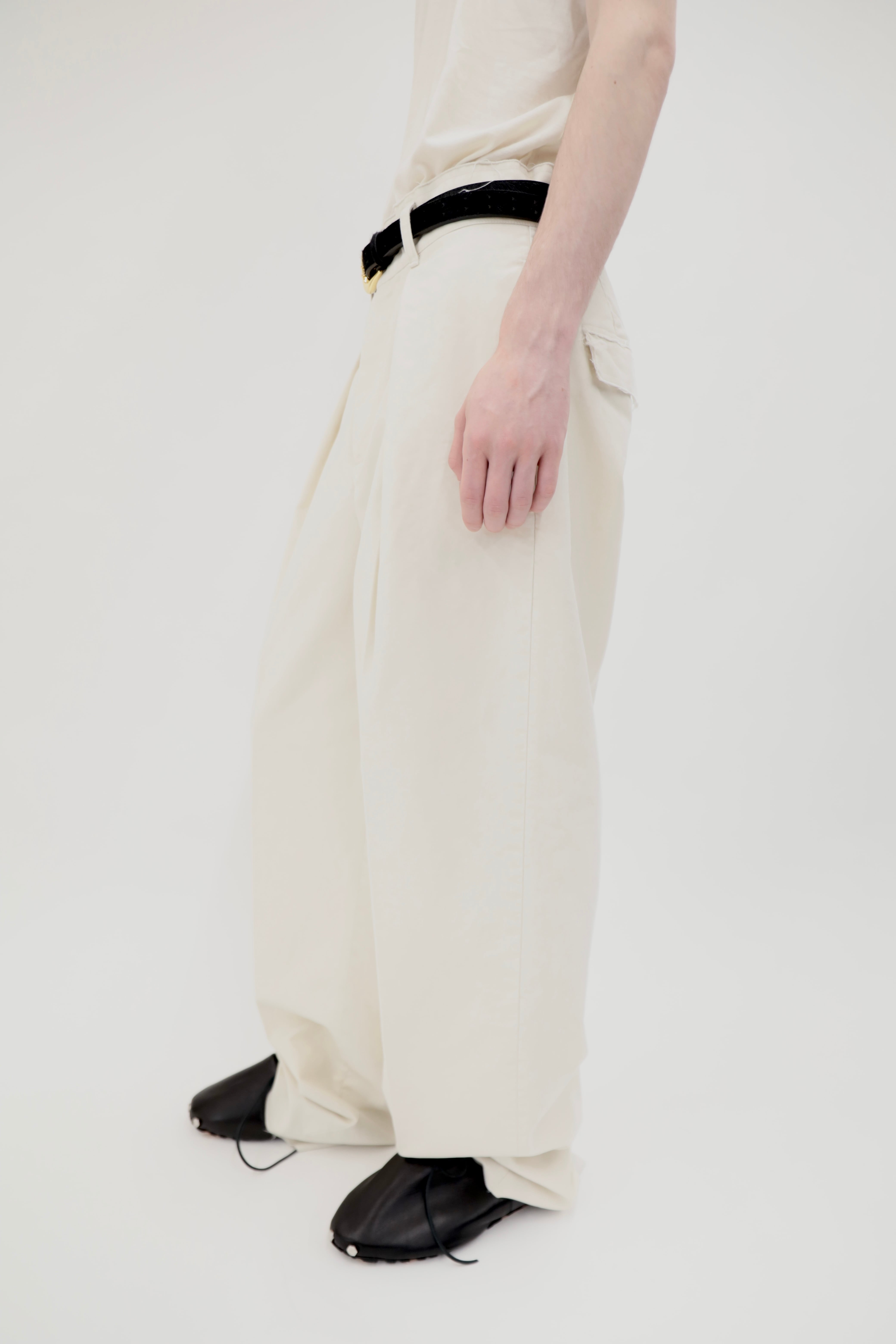 ワイドシルエット、六角ベルトループ、深い1タック、センタープレス。