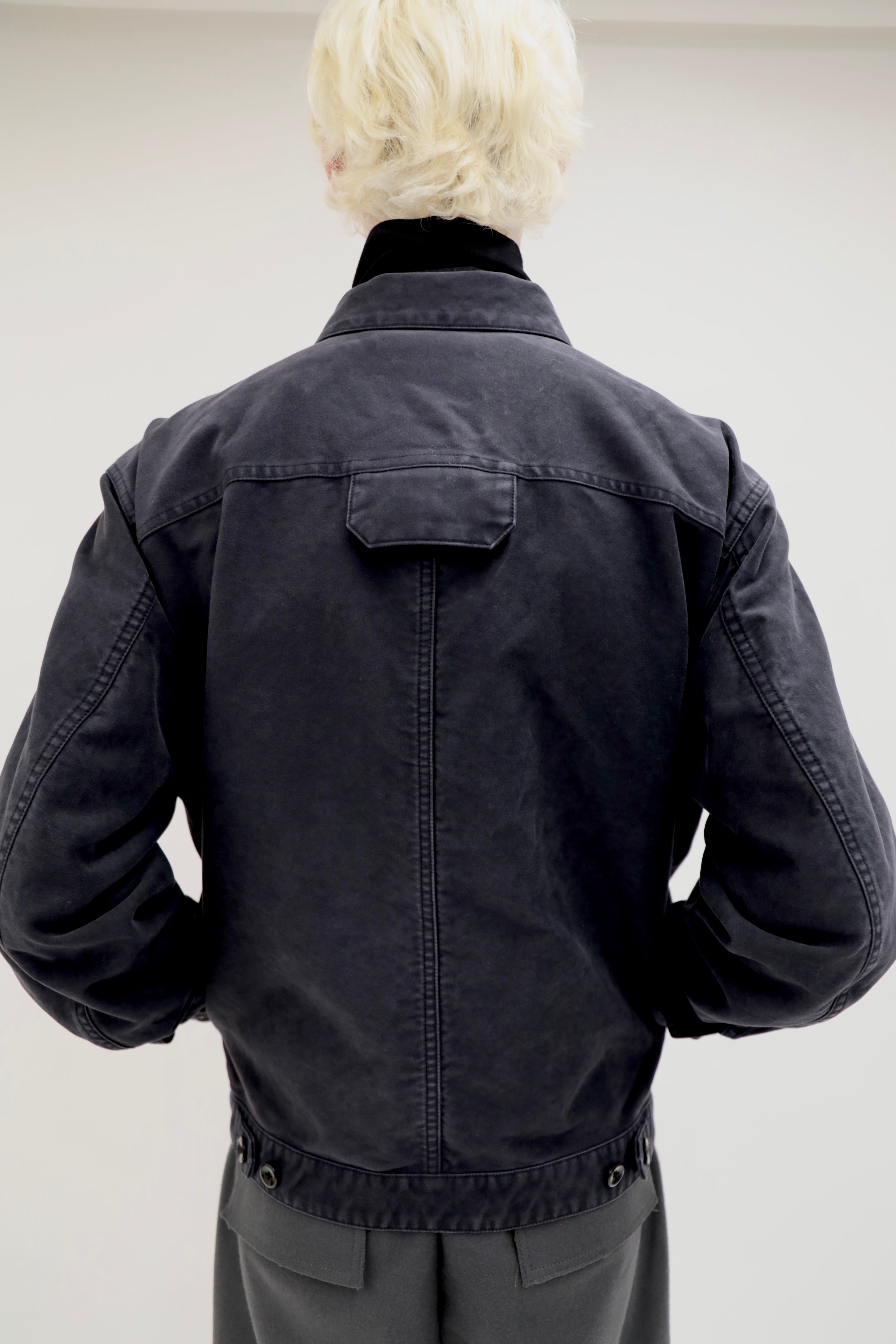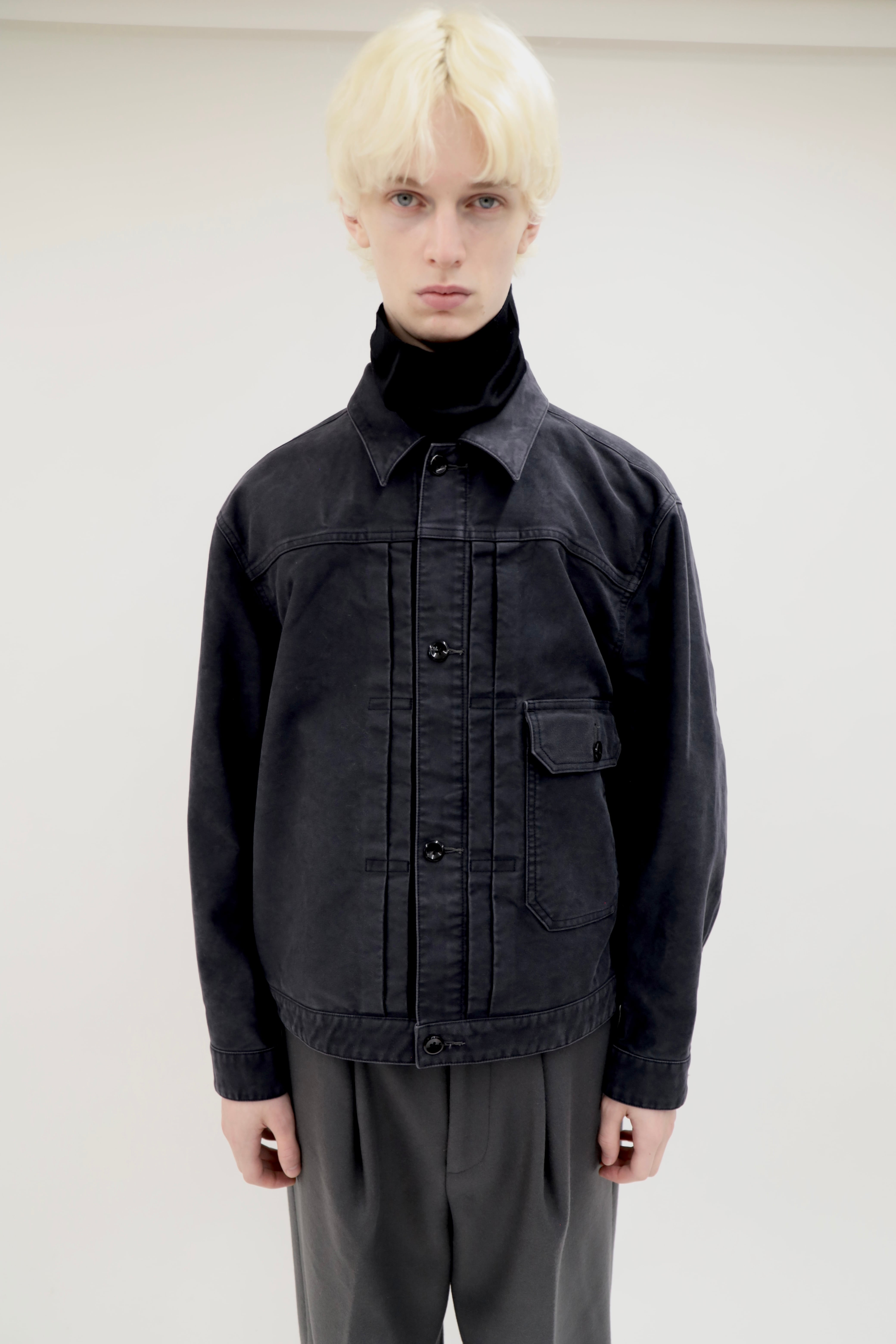 高密度に織り上げた日本製オーガニックコットン・モールスキンを硫化染めし、トラッカージャケットに仕立てました。製品洗いによって生まれるパッカリングと力強いフェードが、着込むほどに深まる表情を形成します。