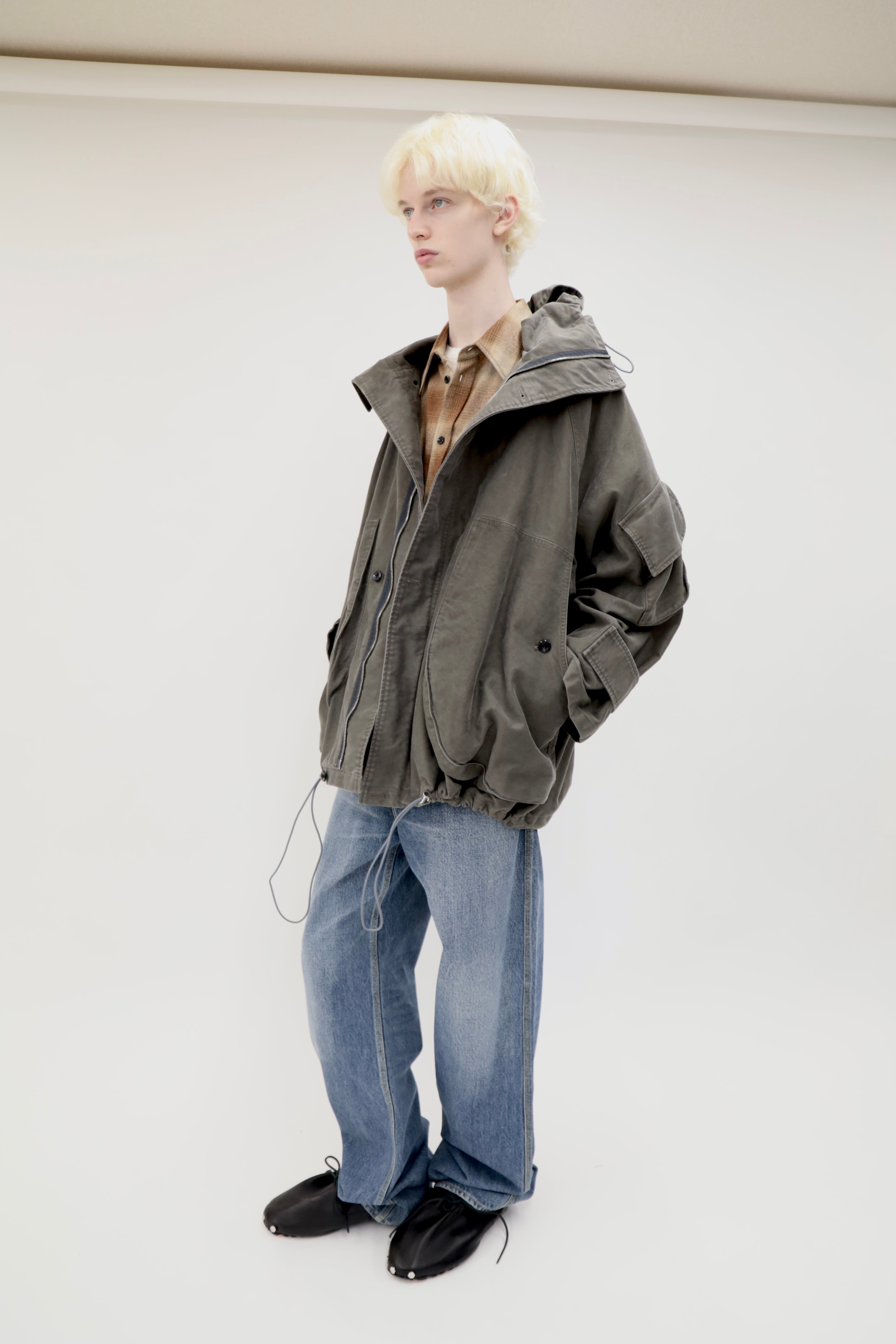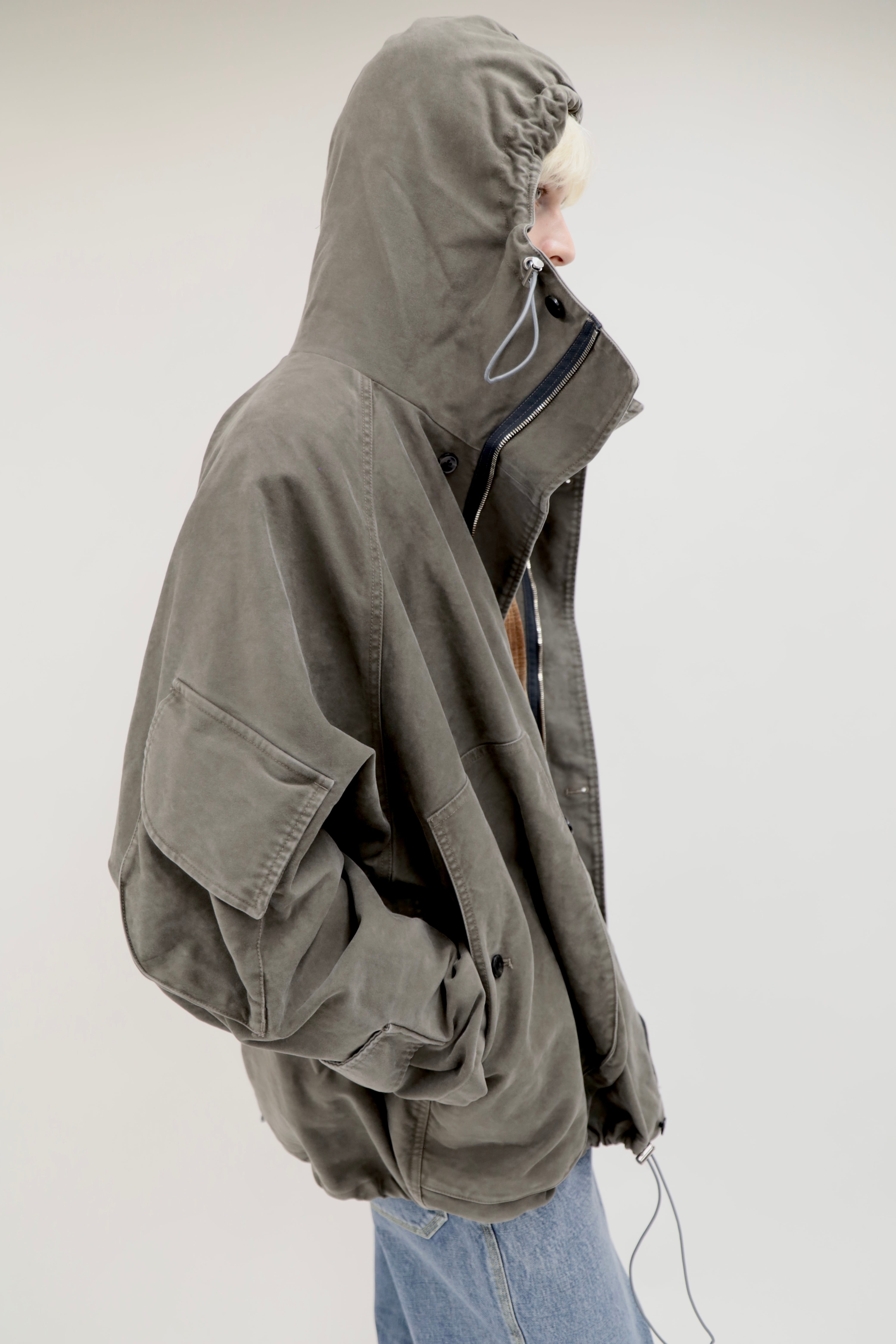 高密度に織り上げた日本製オーガニックコットン・モールスキンを硫化染めし、大きなフーデッドジャケットに仕立てました。製品洗いによって生まれるパッカリングと力強いフェードが、着込むほどに深まる表情を形成します。