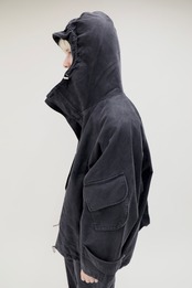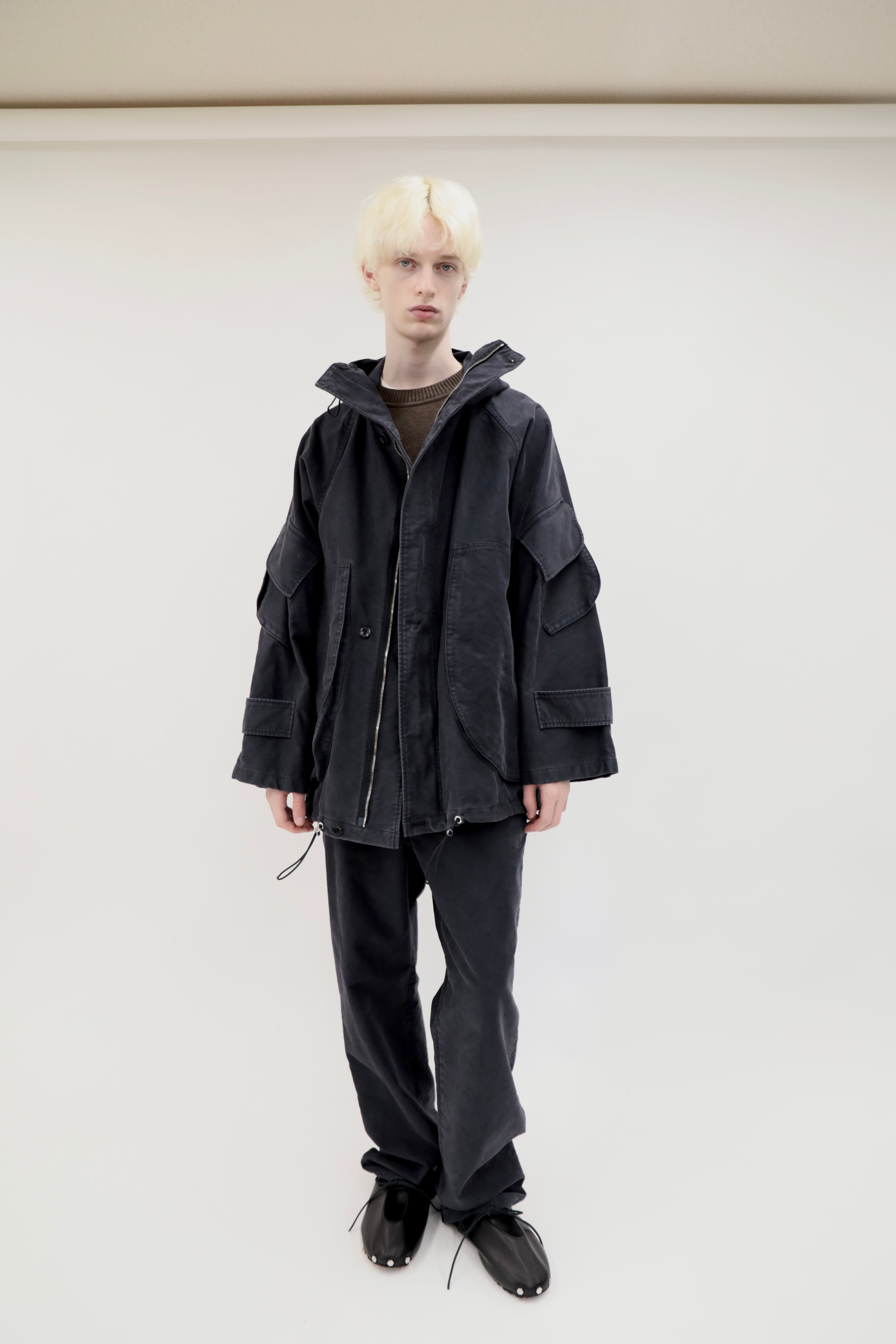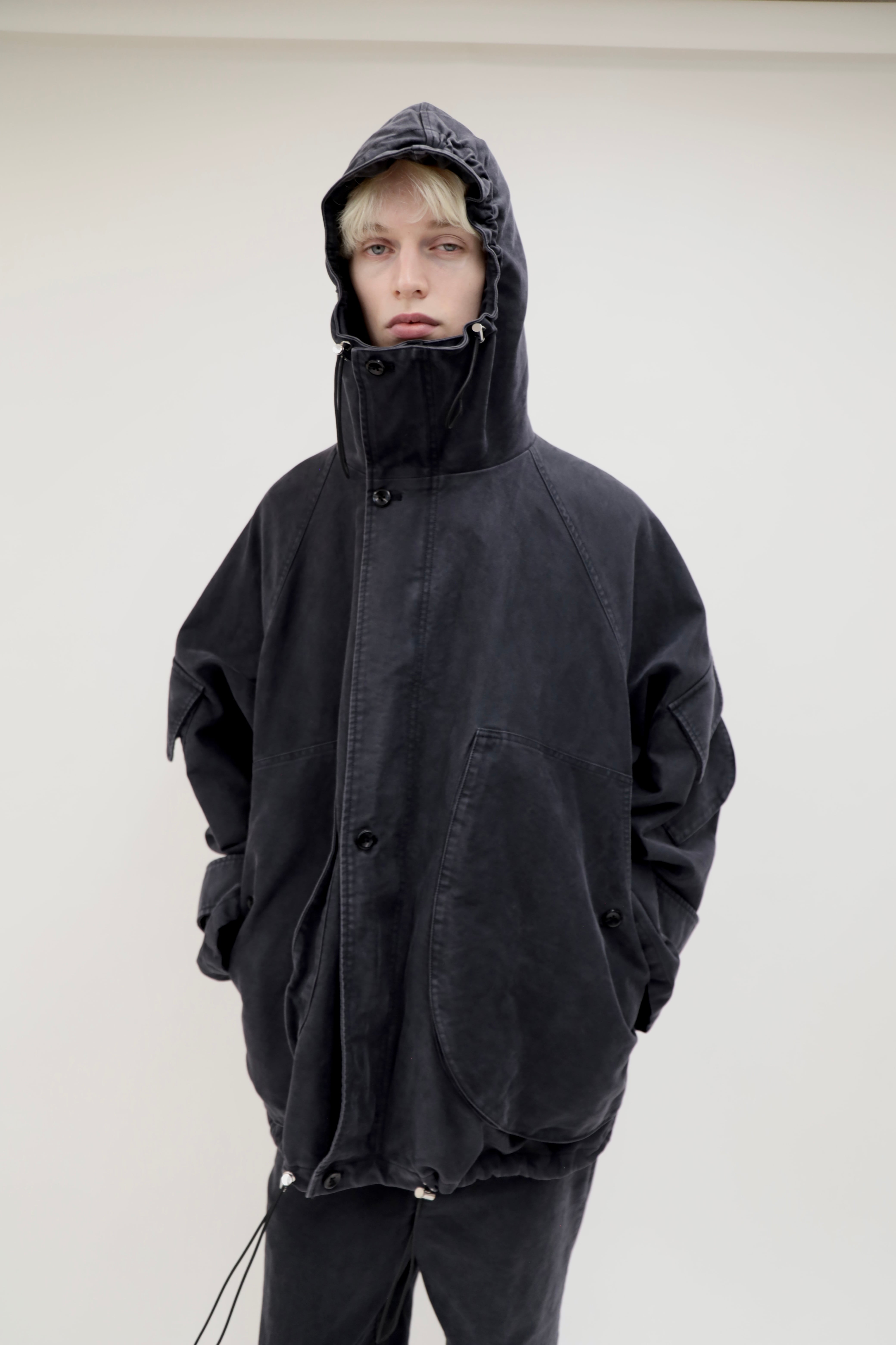 高密度に織り上げた日本製オーガニックコットン・モールスキンを硫化染めし、大きなフーデッドジャケットに仕立てました。製品洗いによって生まれるパッカリングと力強いフェードが、着込むほどに深まる表情を形成します。