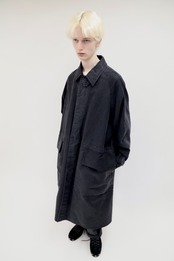 高密度に織り上げた日本製オーガニックコットン・モールスキンを硫化染めし、マックコートに仕立てました。製品洗いによって生まれるパッカリングと力強いフェードが、着込むほどに深まる表情を形成します。