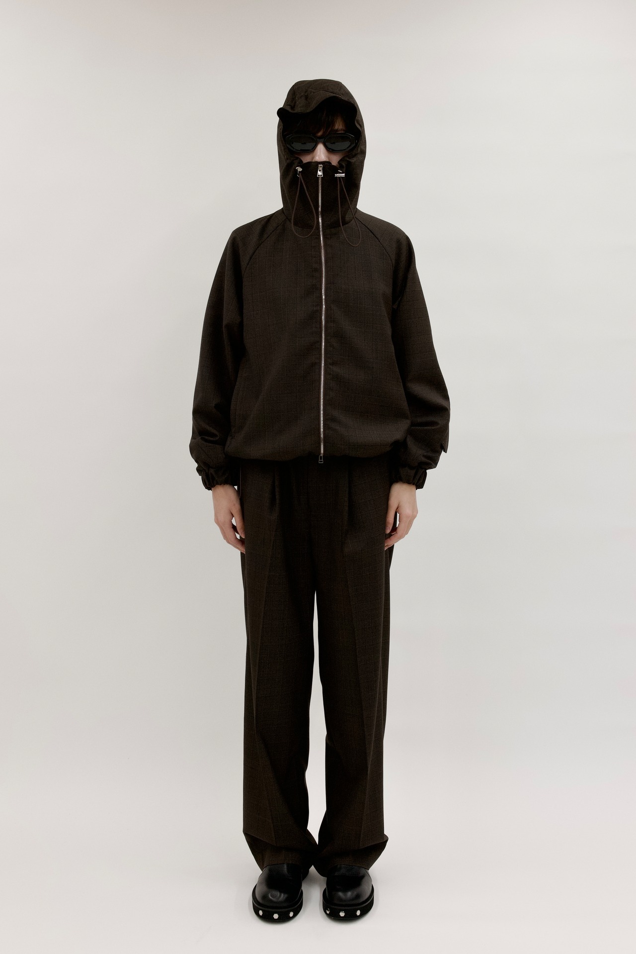 イタリア製のヴィンテージファブリックを使い、ワイドトラウザーを仕立てました。柔らかな秋らしいブラウンチェック。深い1タック、センタープレス、六角ベルトループ。