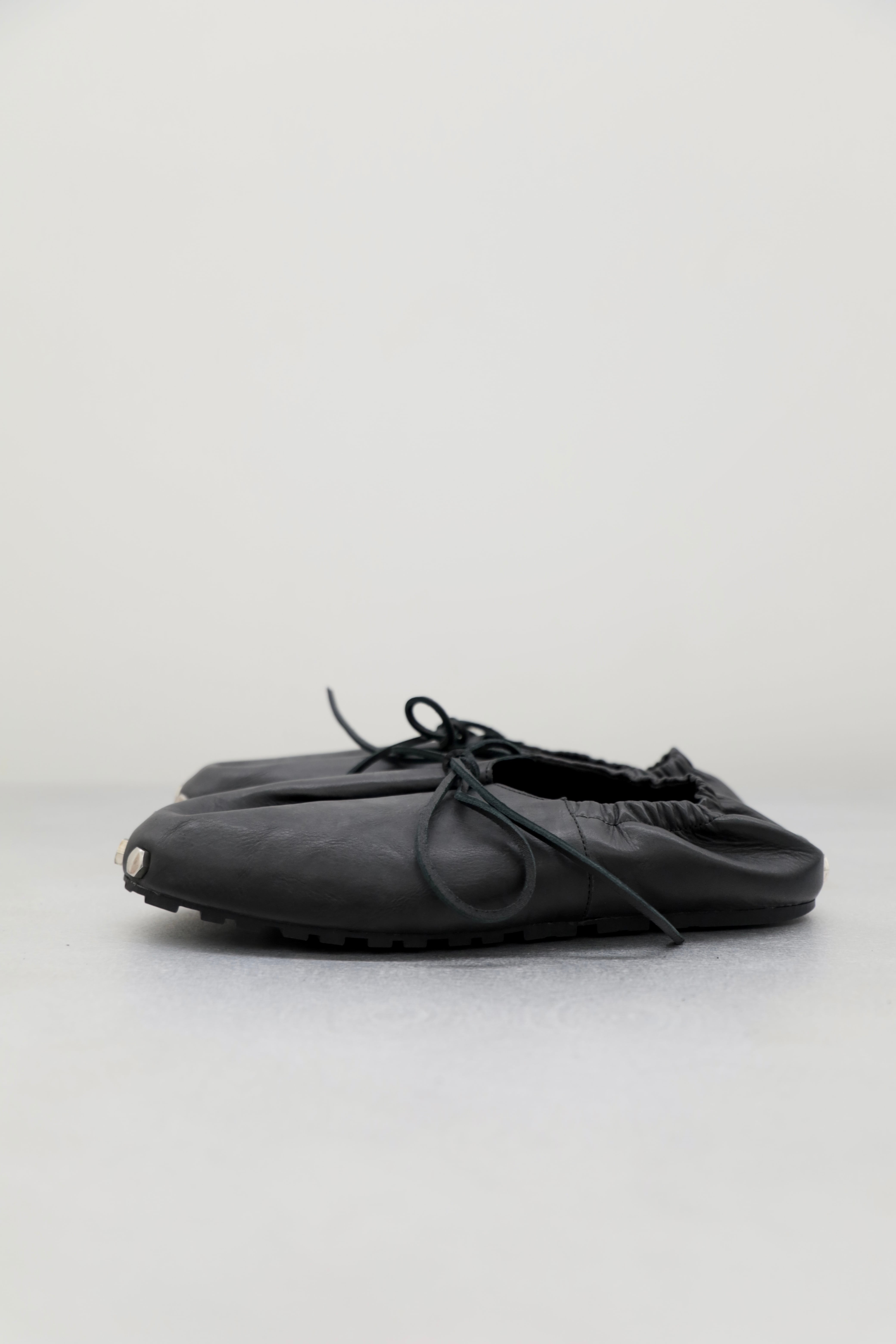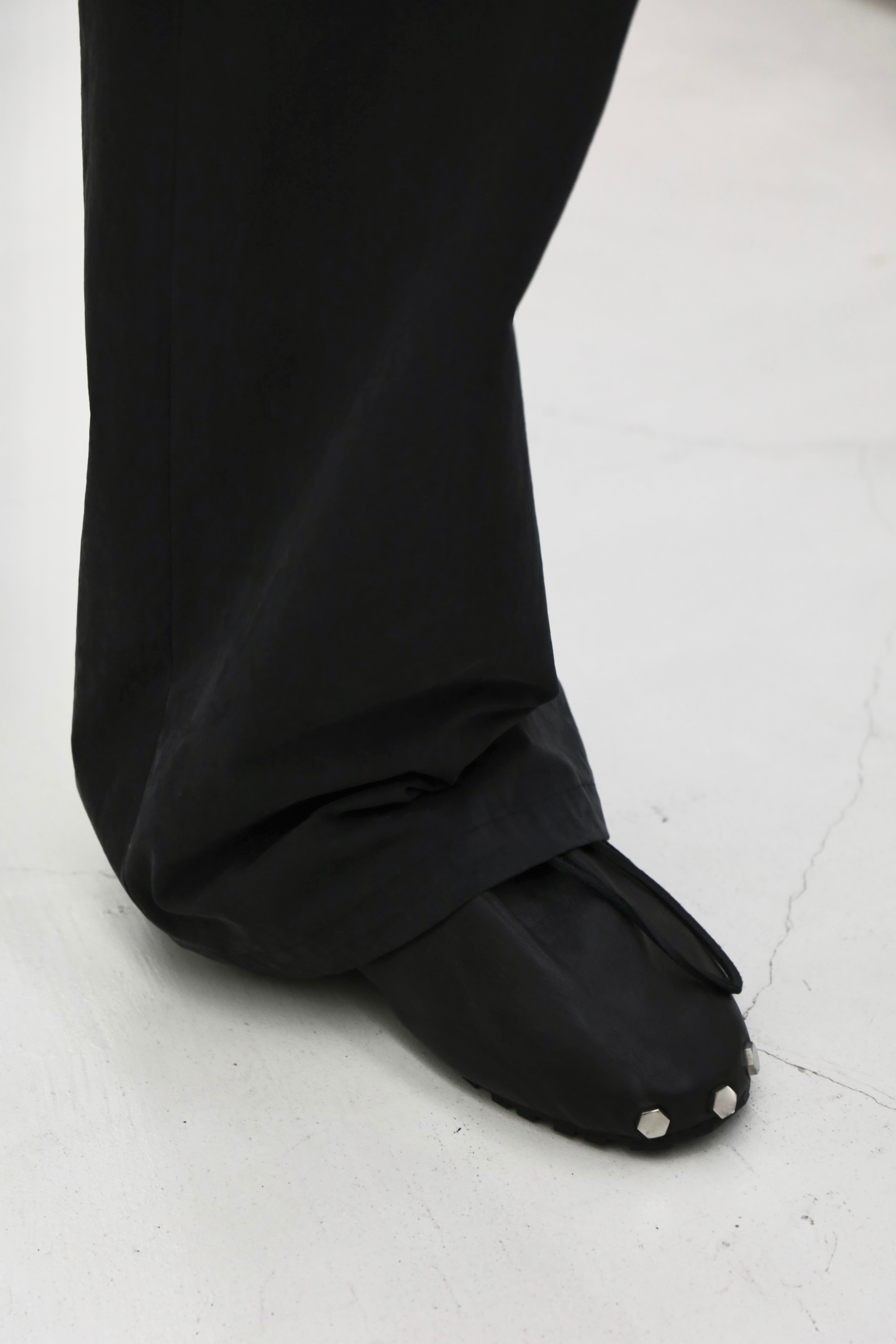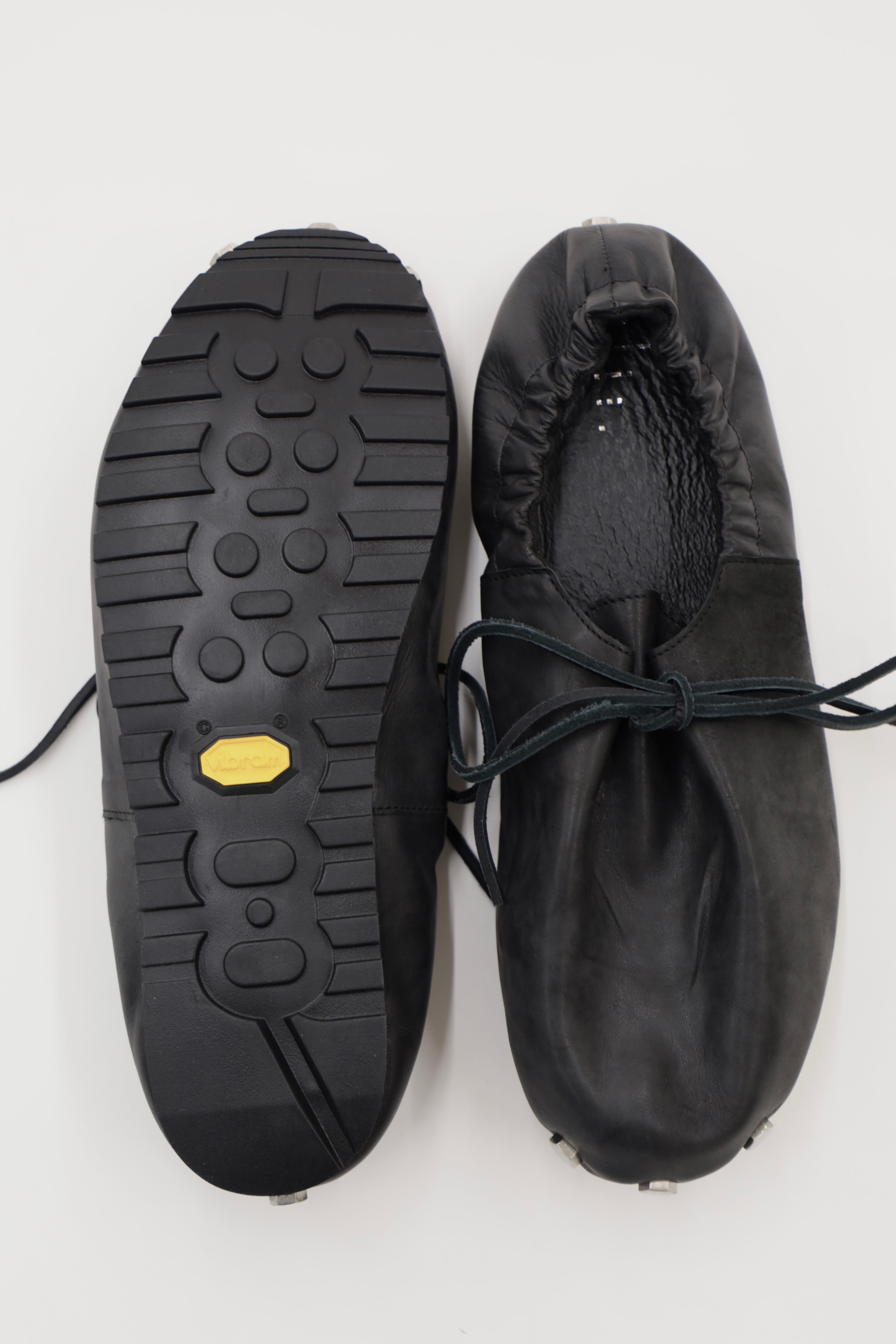 丁寧に研磨した六角ボルトを打ち込んだフラットシューズ。踵部分を折って履くことが可能です。