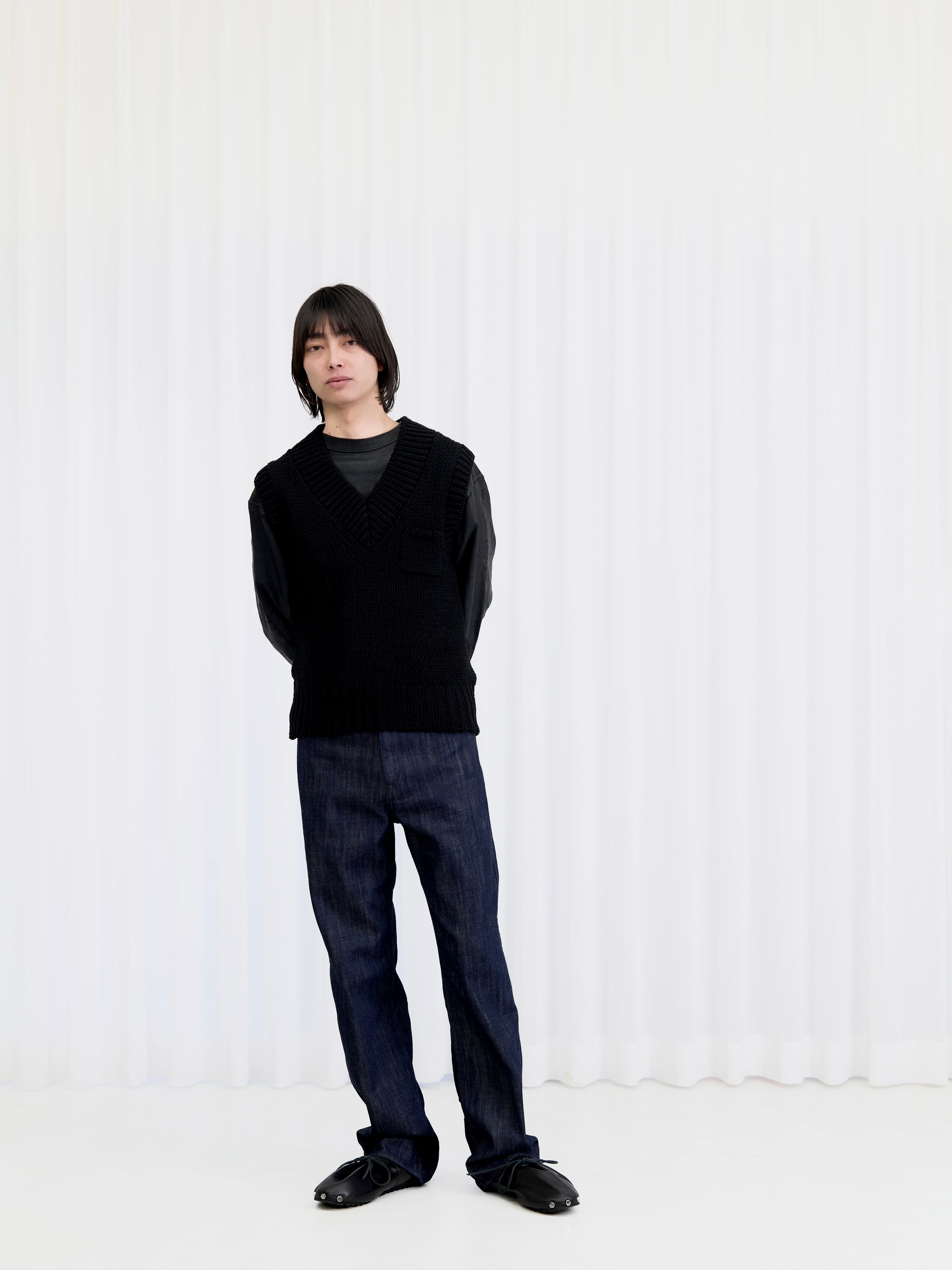 通常のメリノより縮れが細かいため膨らみとコシがあります。糸を2本取り3ゲージの天竺編みにして、アノニマスなVネックベストに仕立てました。