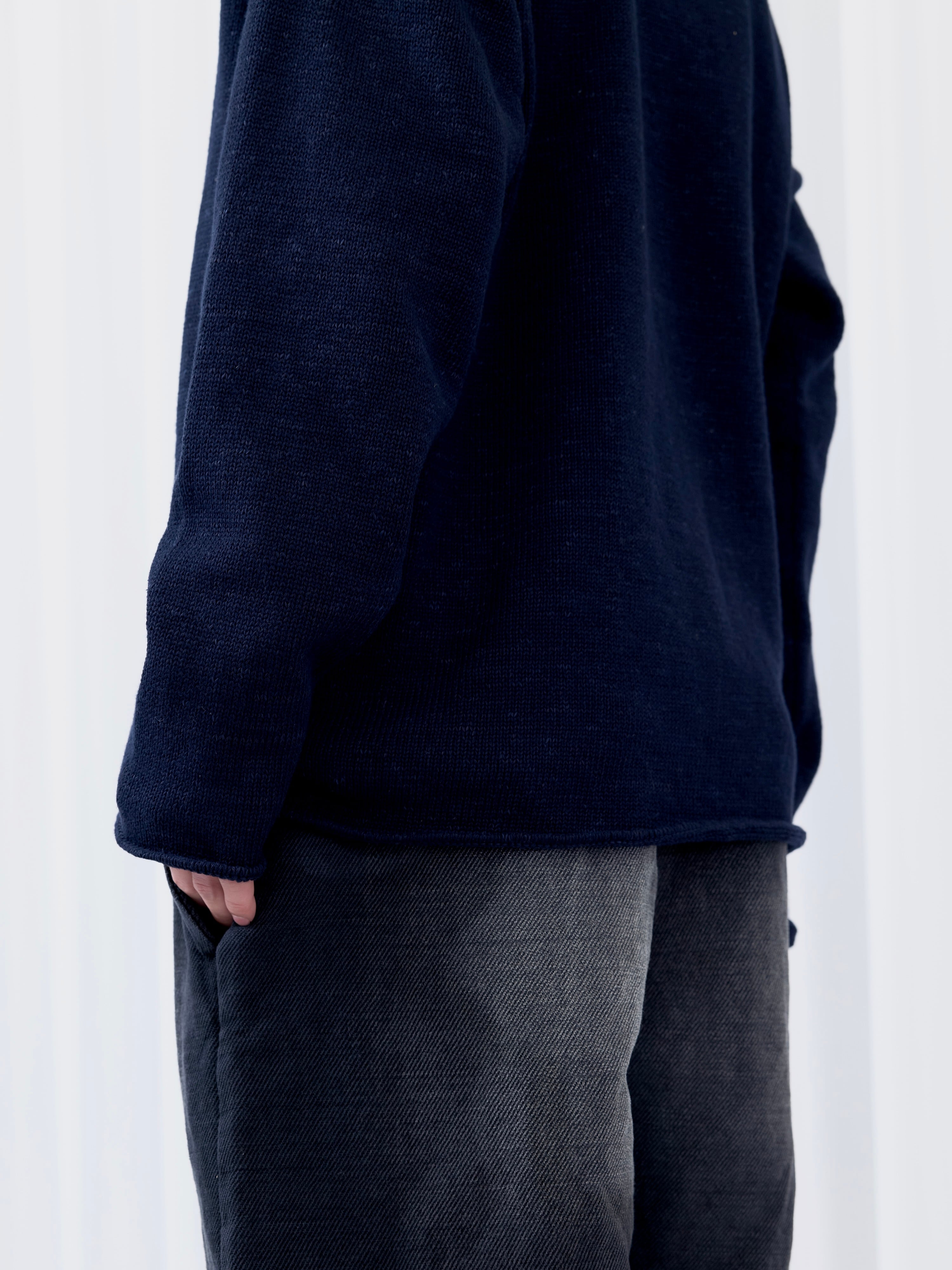 疑麻加工を施した清涼感のあるスラブコットン糸を用い、緩やかなVネックセーターを編み立てました。