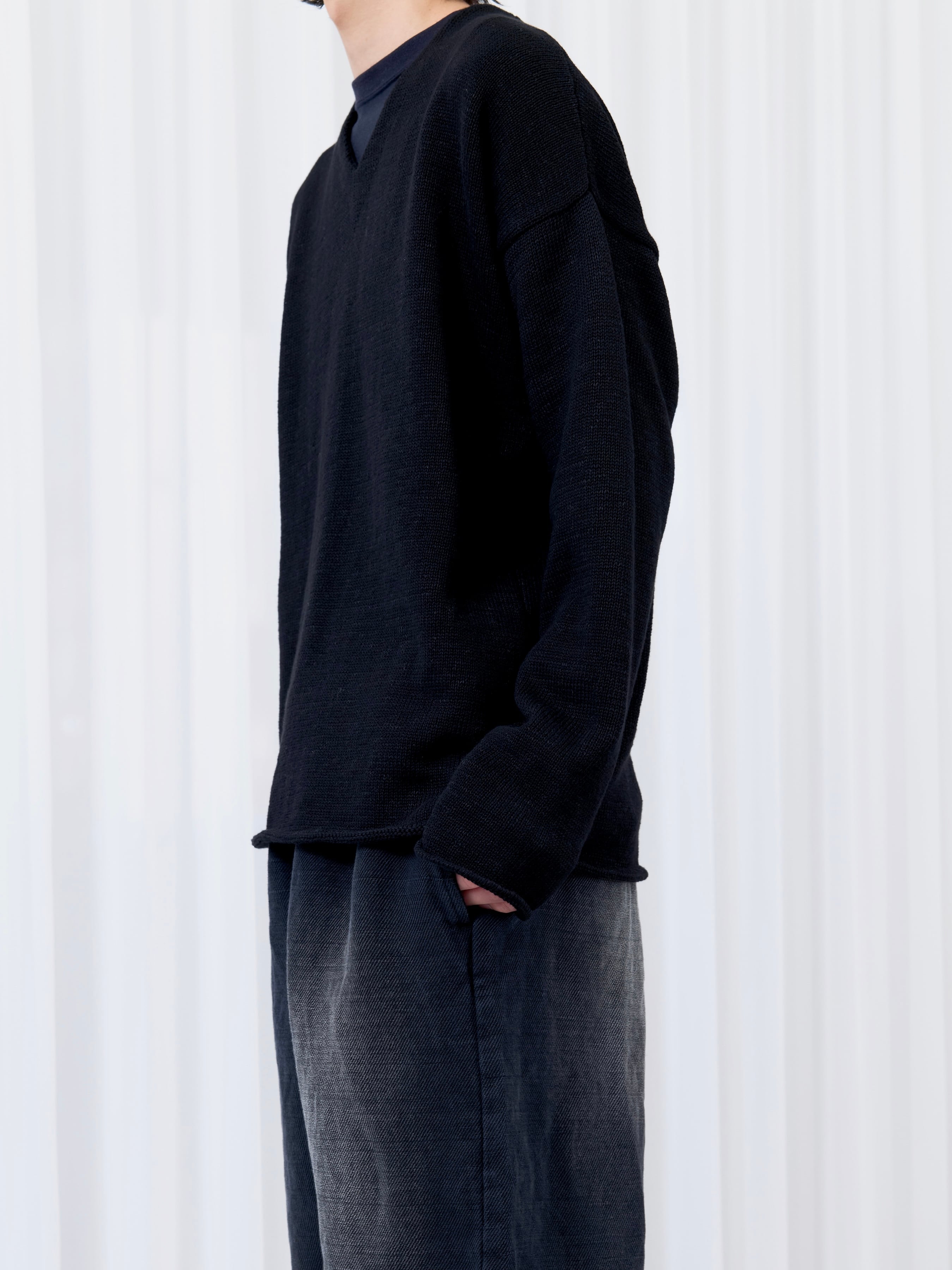 疑麻加工を施した清涼感のあるスラブコットン糸を用い、緩やかなVネックセーターを編み立てました。