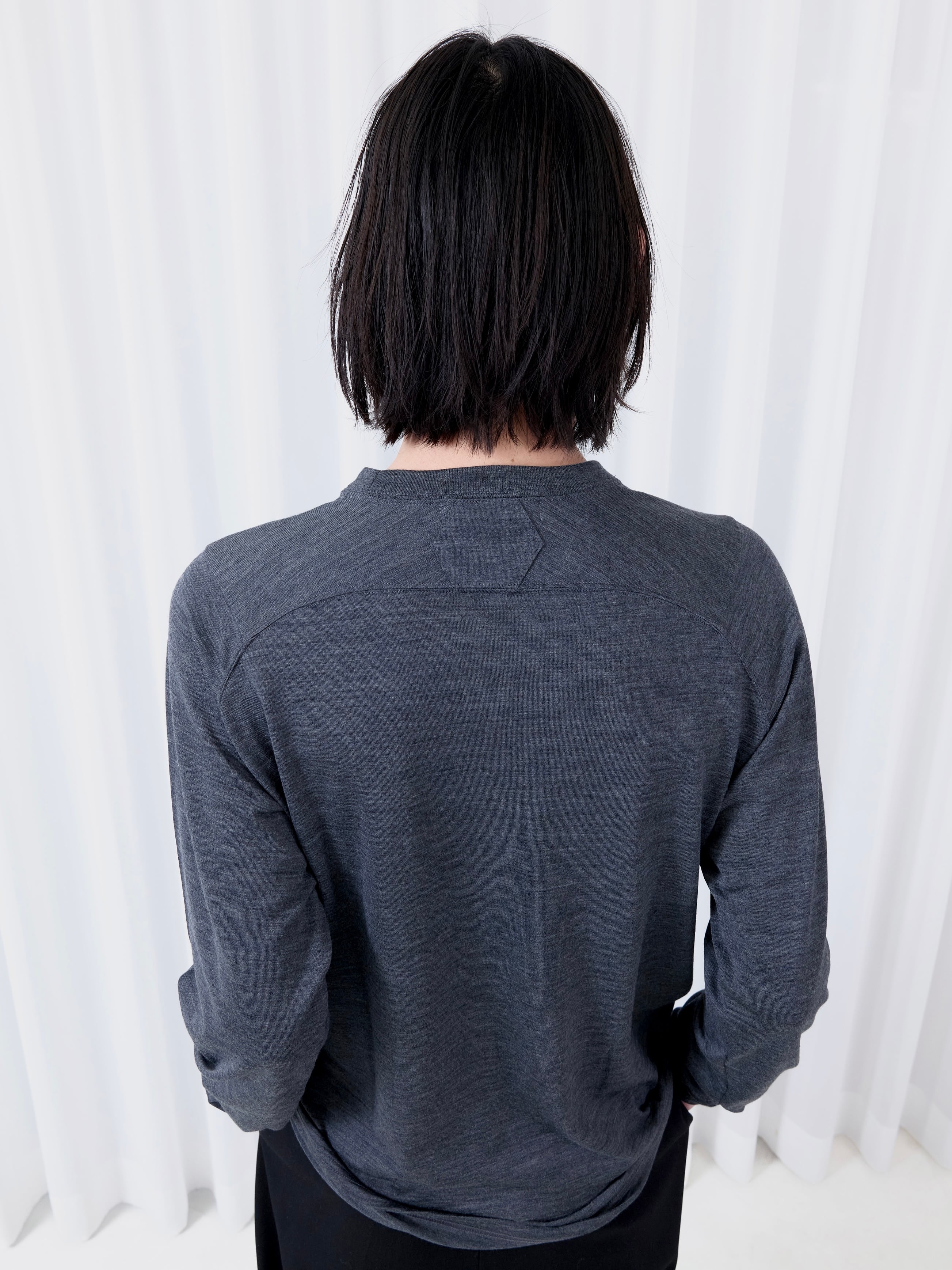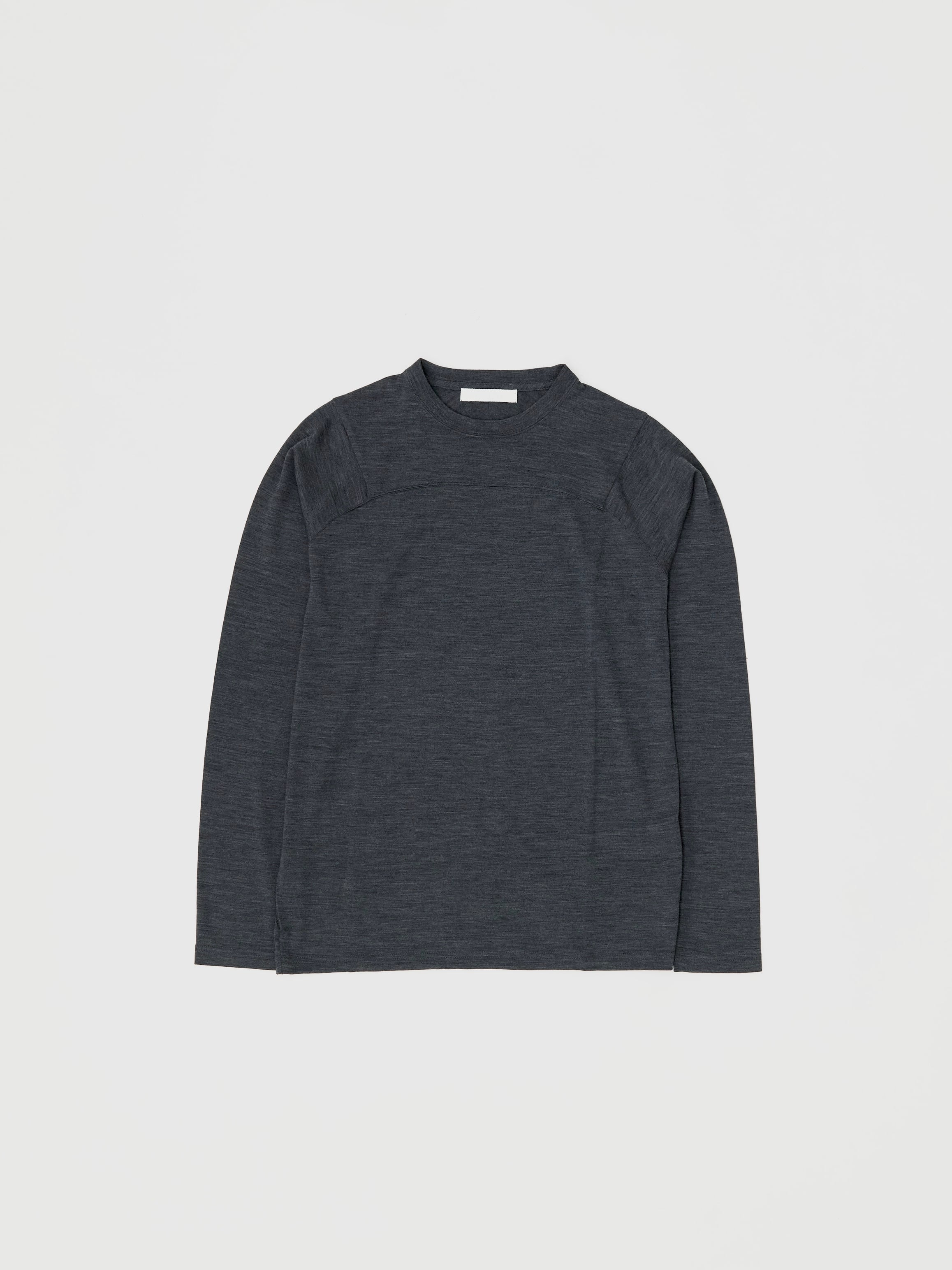 SUPER120'sのニュージーランド産メリノウールを、アノニマスなフットボールシャツに仕立てました。嵩高性がありながらも毛羽立ちが極めて少なく、非常にソフトなタッチ感が特徴です。