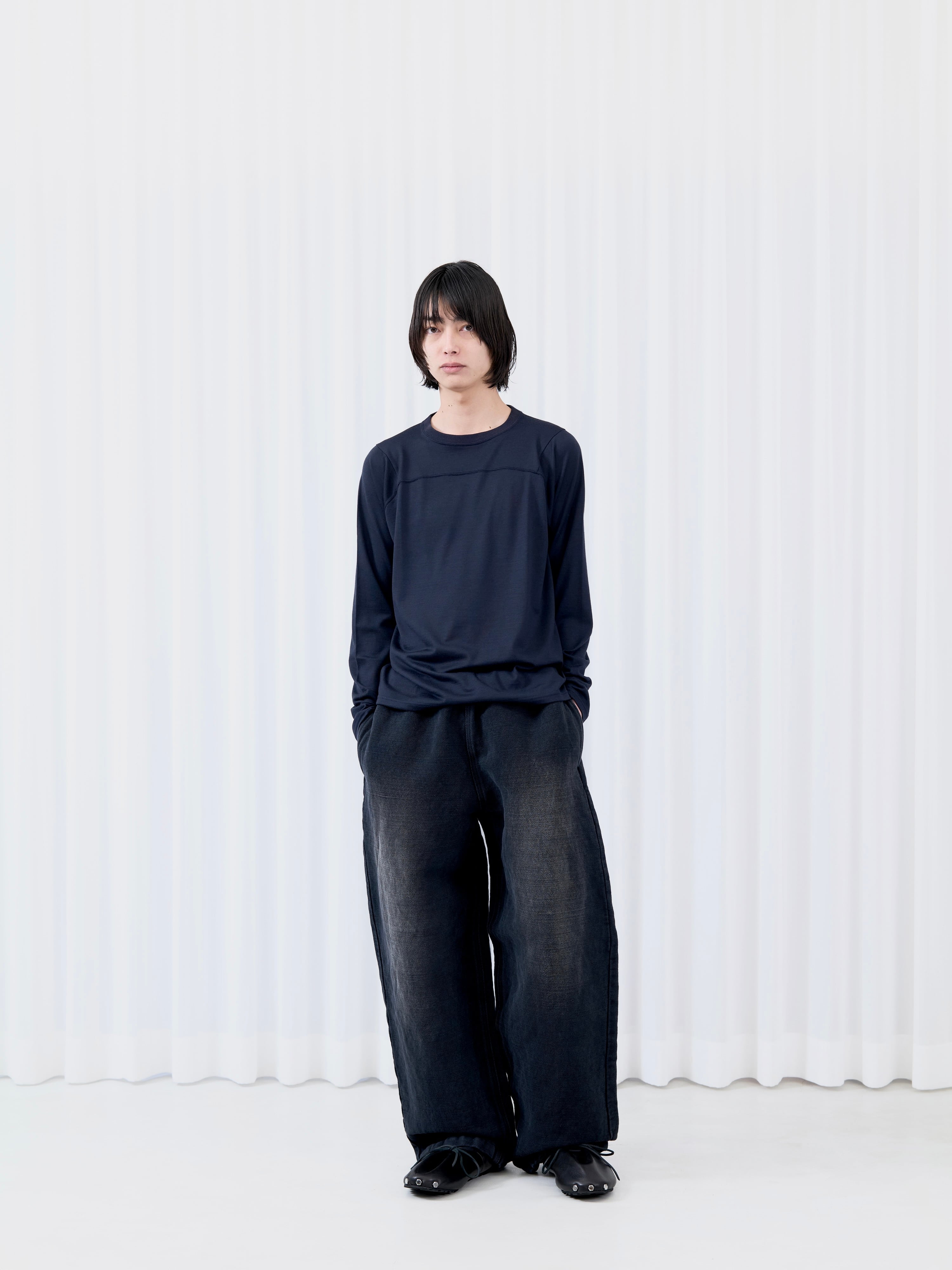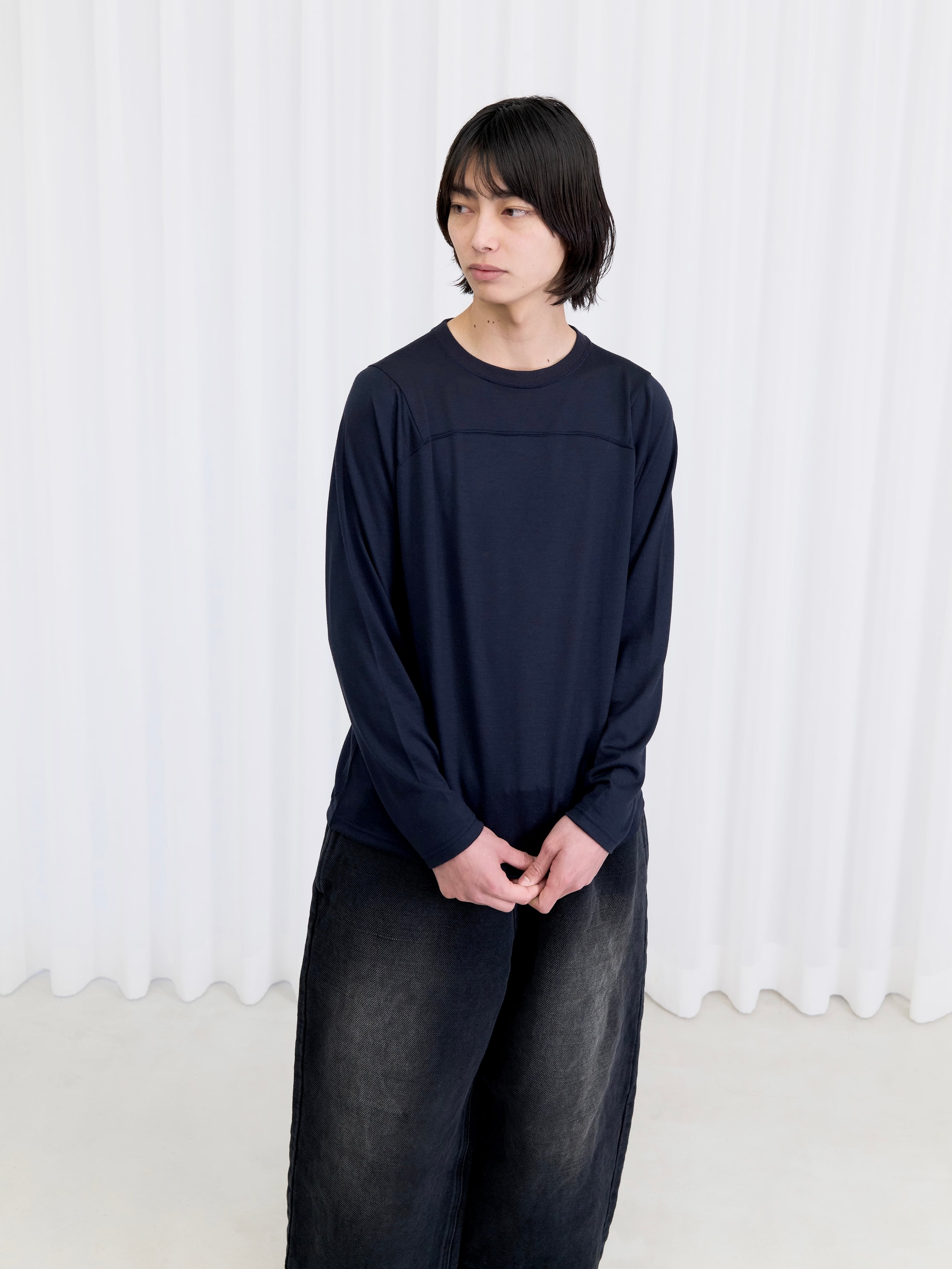 SUPER120'sのニュージーランド産メリノウールを、アノニマスなフットボールシャツに仕立てました。嵩高性がありながらも毛羽立ちが極めて少なく、非常にソフトなタッチ感が特徴です。