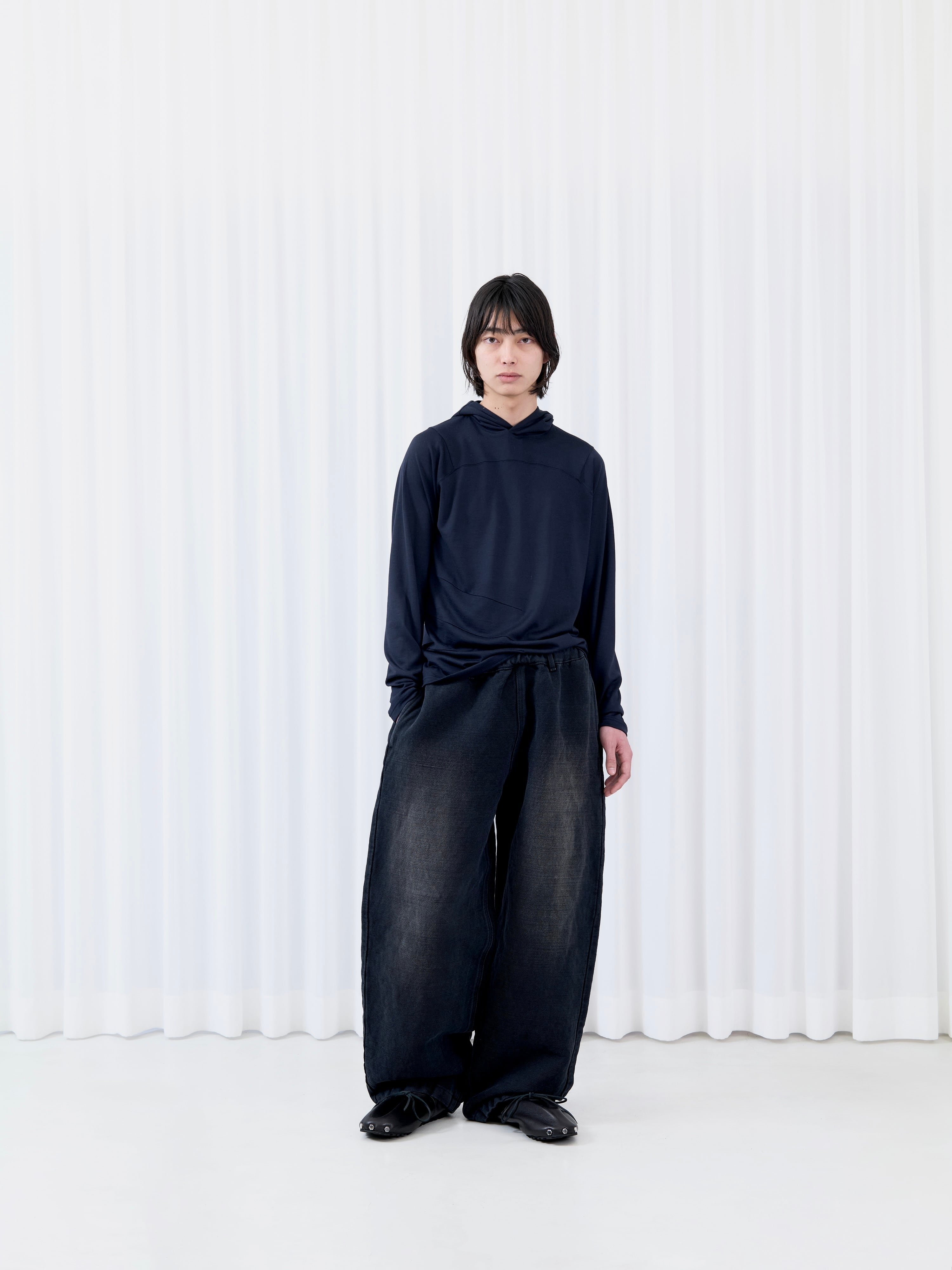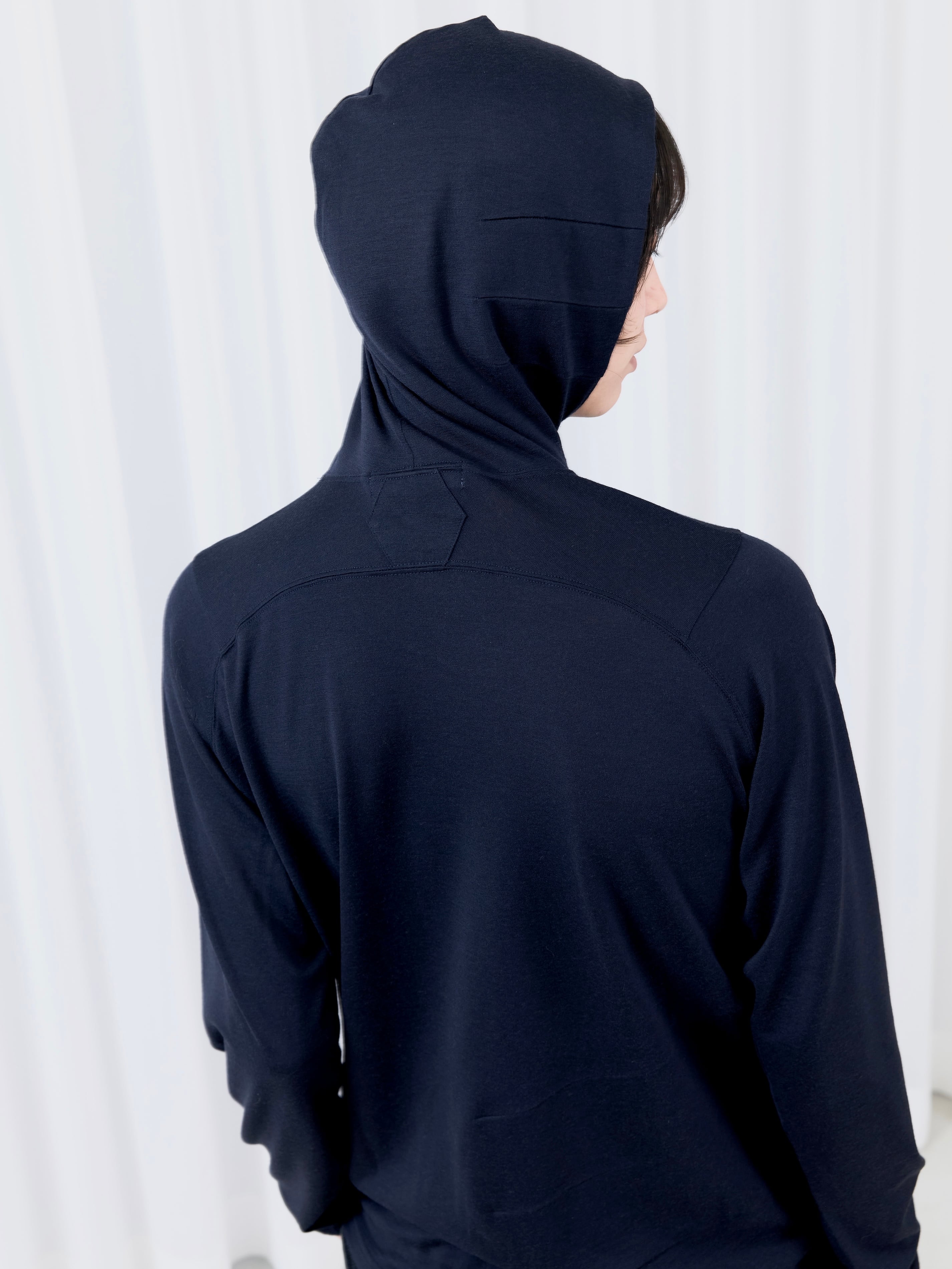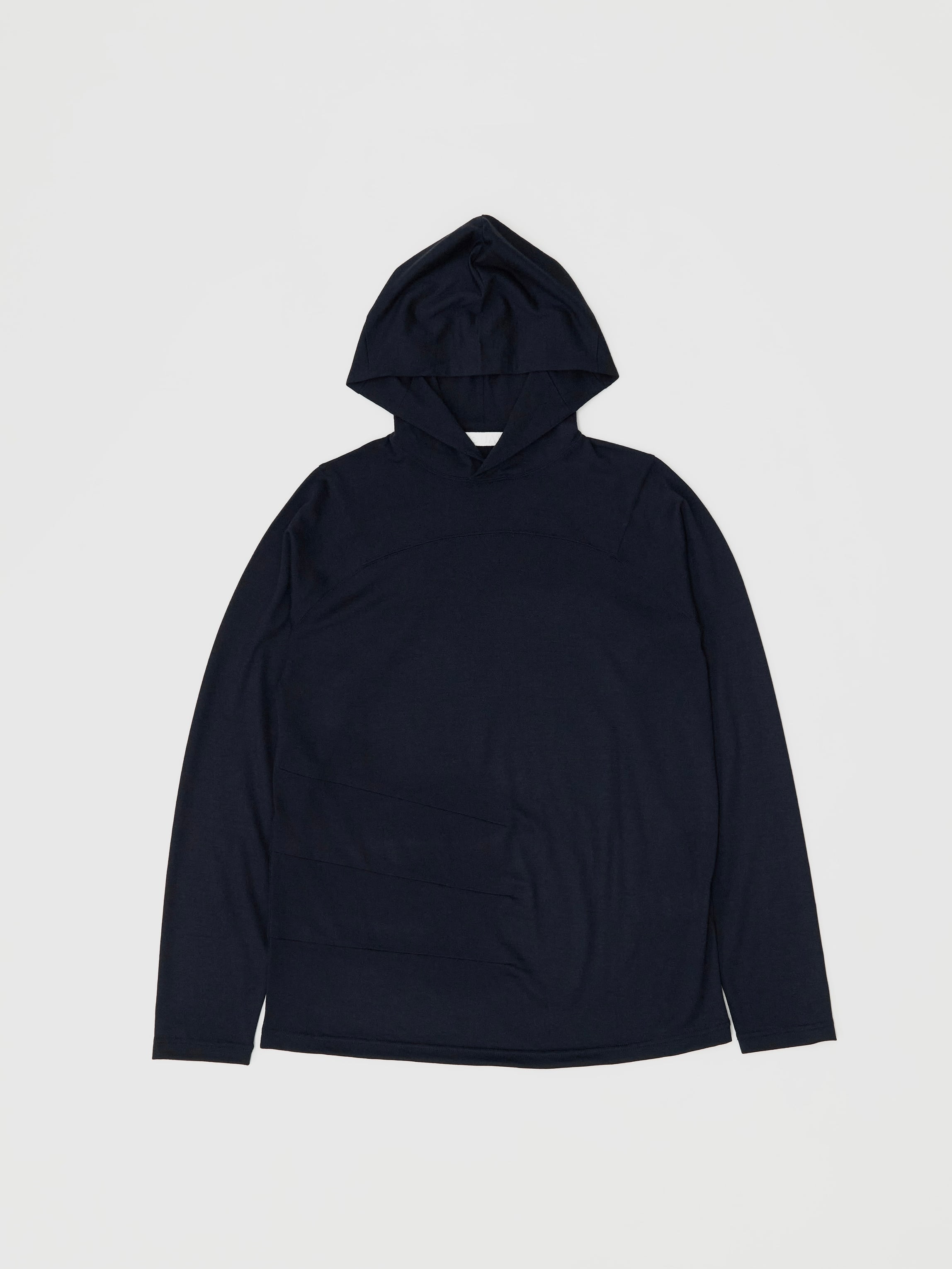 SUPER120'sのニュージーランド産メリノウールを、アノニマスなフットボールフーディに仕立てました。嵩高性がありながらも毛羽立ちが極めて少なく、非常にソフトなタッチ感が特徴です。
