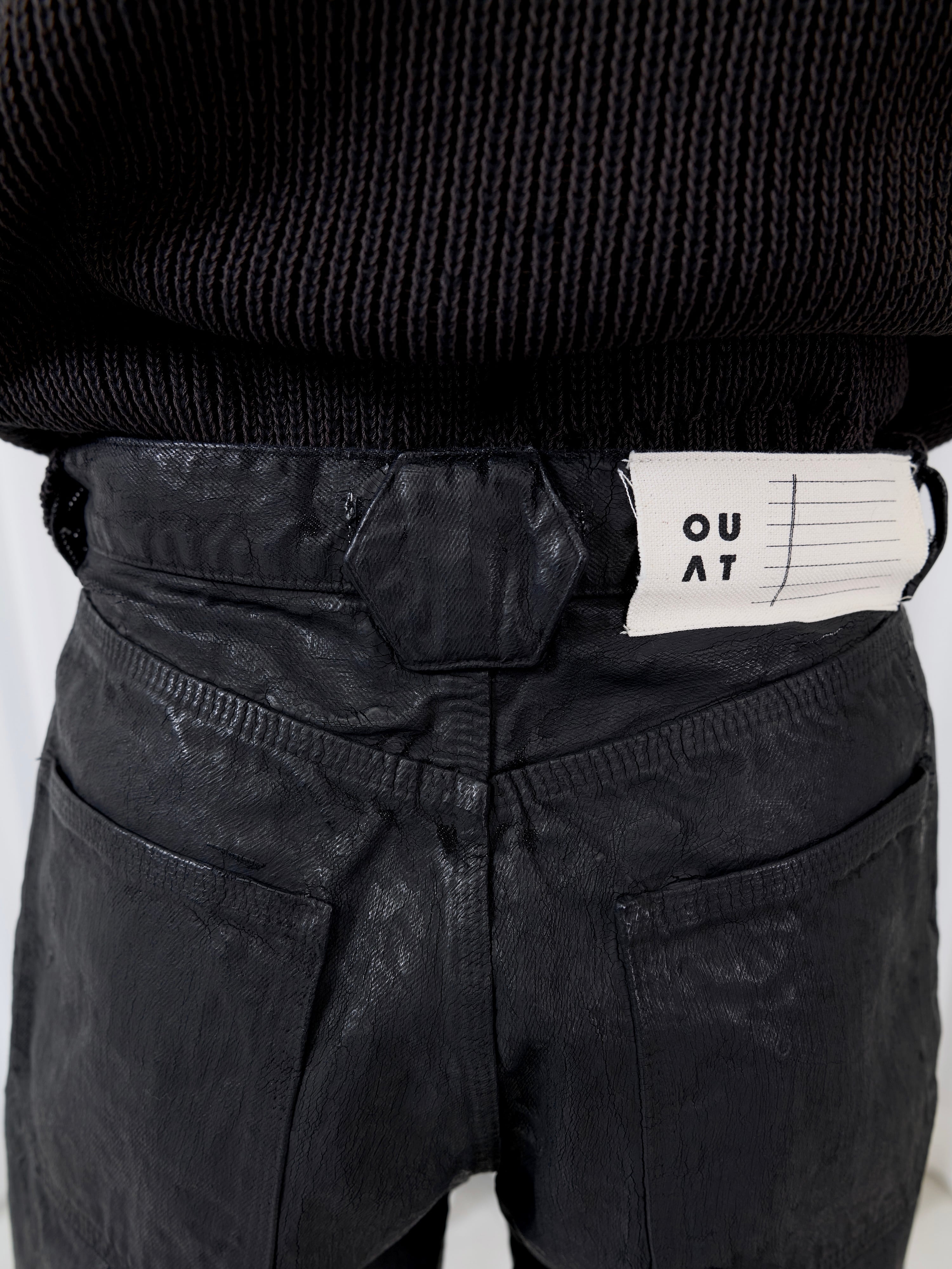 デニム素材、コンサバティブな5ポケットトラウザー、トリプルステッチ、OUATのキャンバスパッチ、六角ベルトループ。