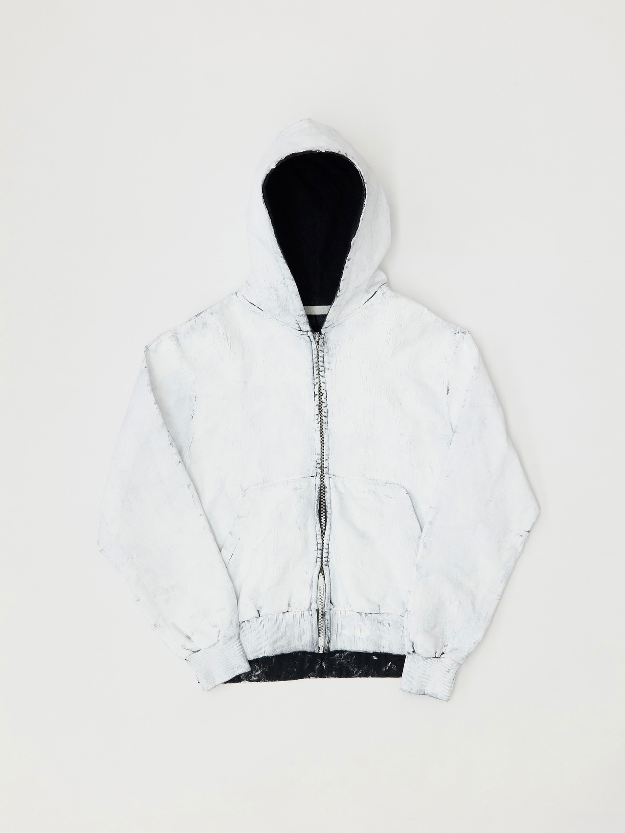 特殊なマッドバインダーと顔料をブレンドしたものを刷毛で何層にも製品に厚塗りしていき、ベーキングと柔軟洗いを施します。全て職人の手作業による丹念な工程は、着用するにつれて厚く盛り上がった箇所が美しいクラックを生み出し、テクスチャや艶も変化していくことによって、経年変化を楽しめる加工になっております。このような特性が陶器を想起させることから、私たちはこれらの製品群を"CERAMIC"と名付けました。