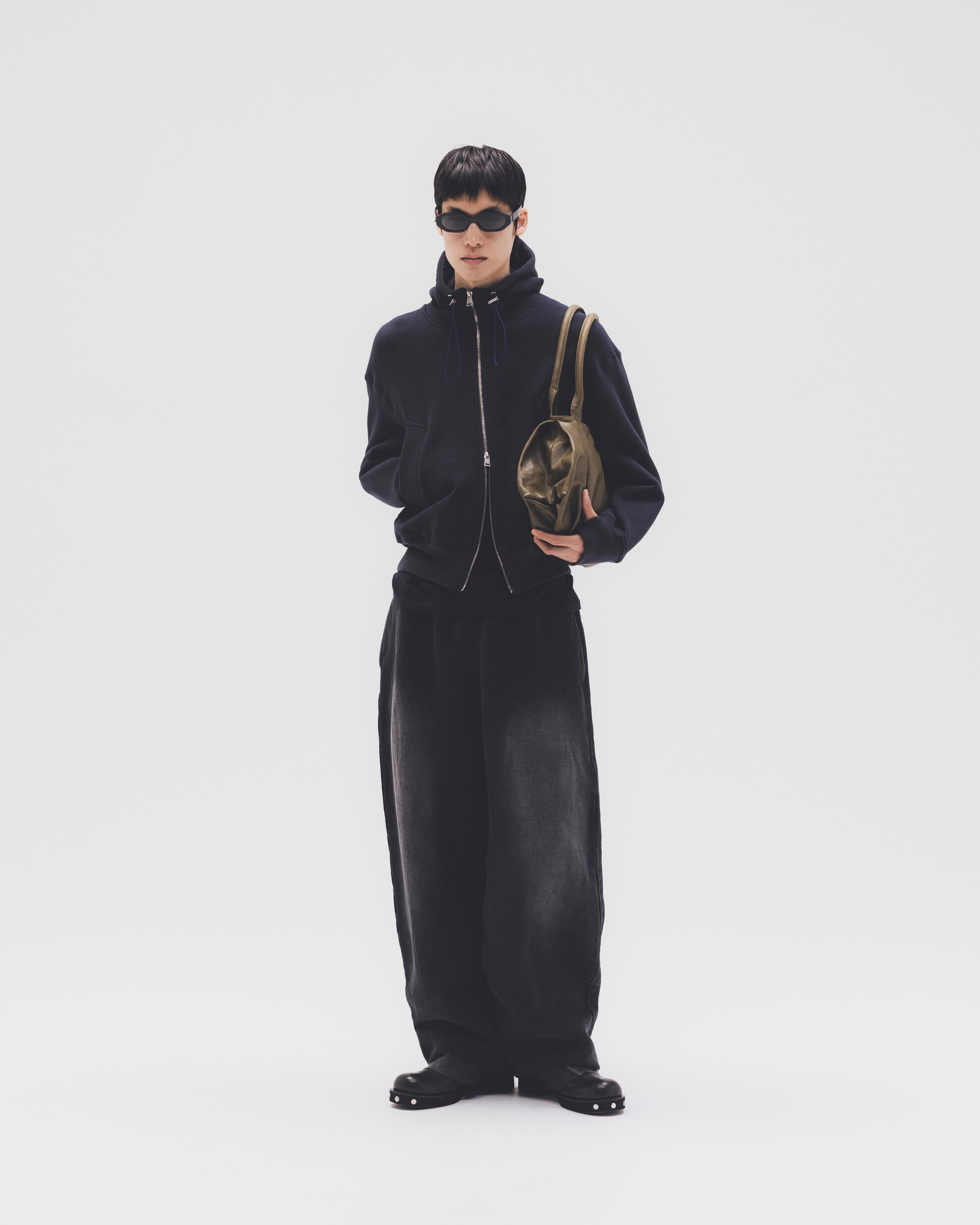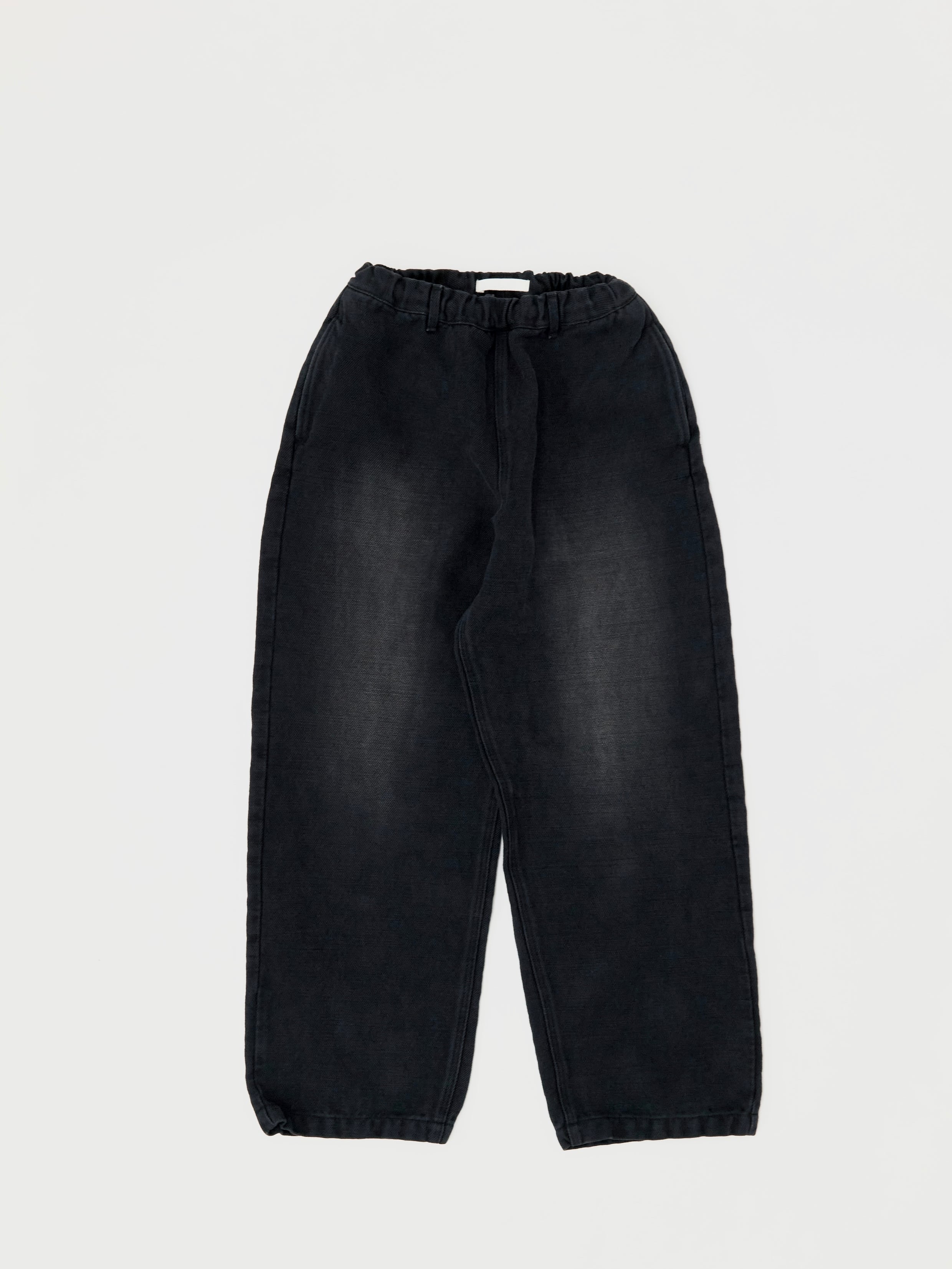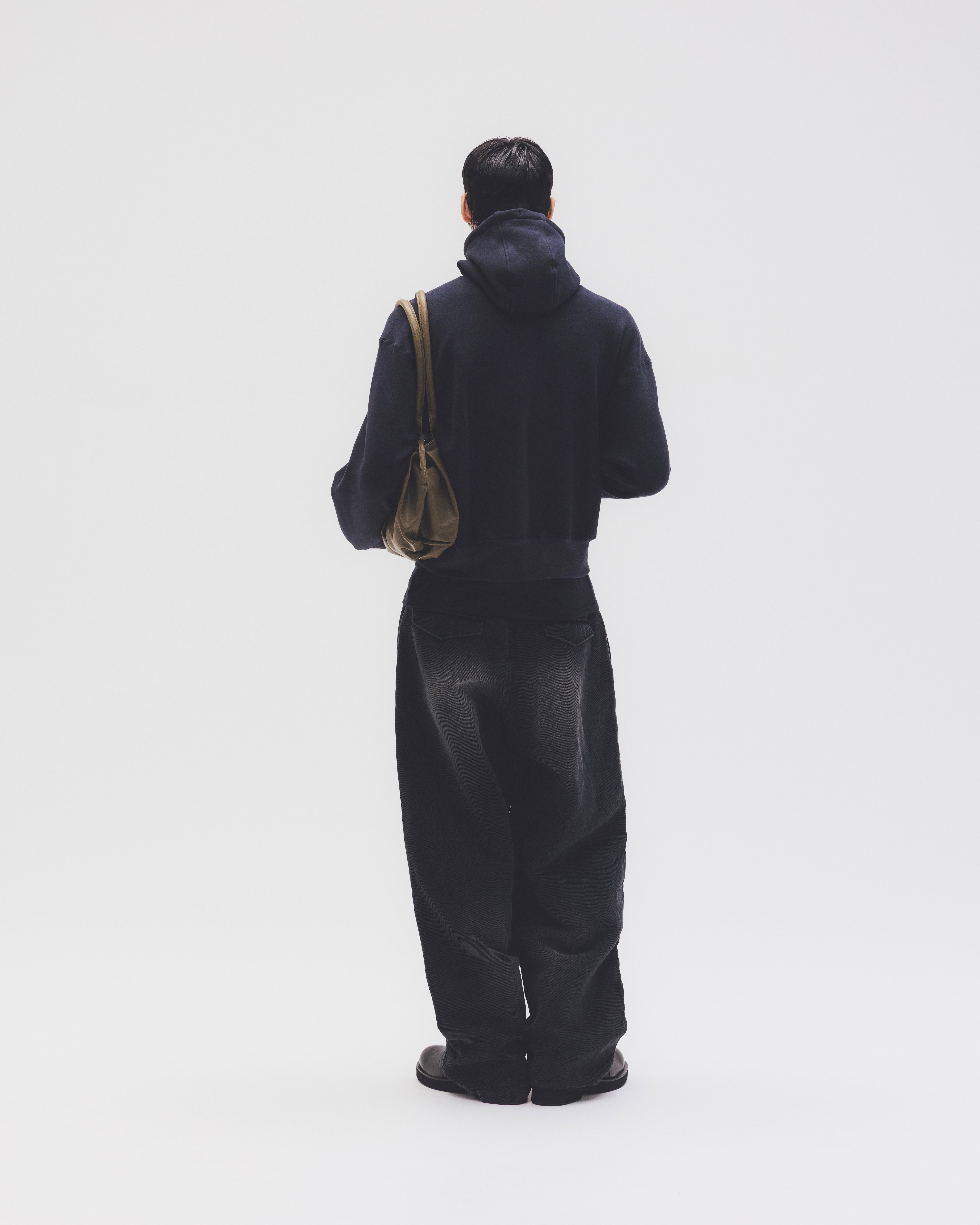 武道着やヘビーデューティーなバッグに使用される地厚な綿麻ヘビーツイルを、リラックスパンツに仕立てました。ブラスト加工、ストーンバイオウォッシュ、そして特殊な柔軟加工を含む一連の丹念な工程を経て、肉厚ながらしなやかで柔軟な素材へと変貌を遂げます。最後に手作業でフェード加工を施すことで、立体的で表情豊かなテクスチャを表現しました。