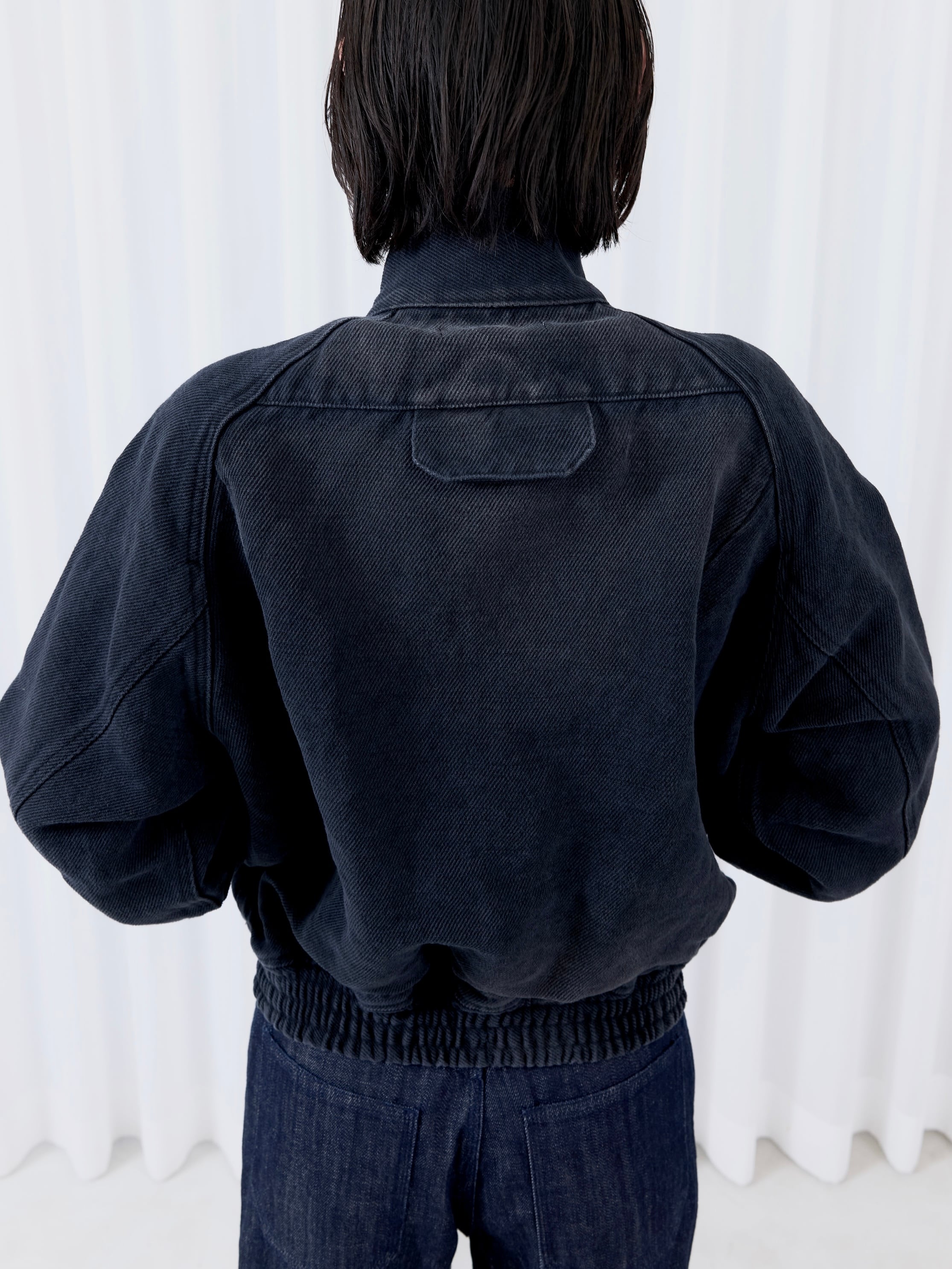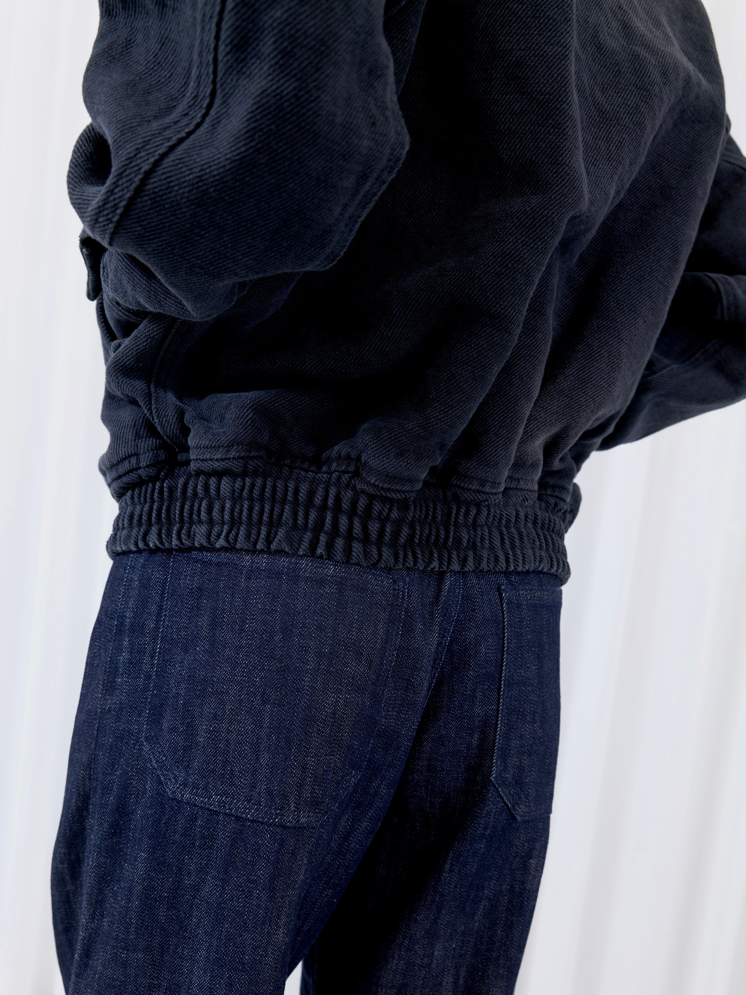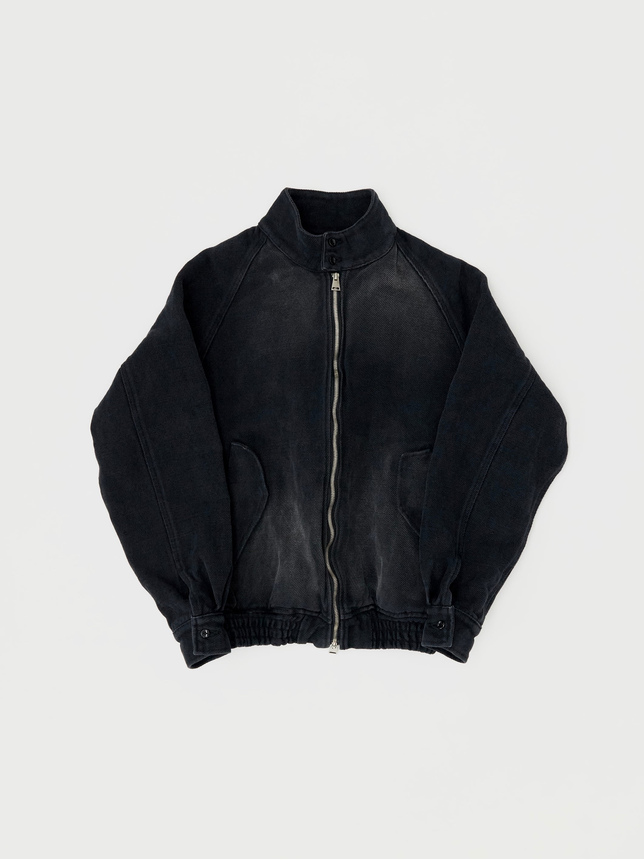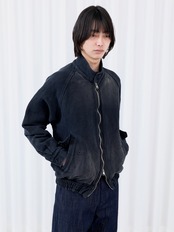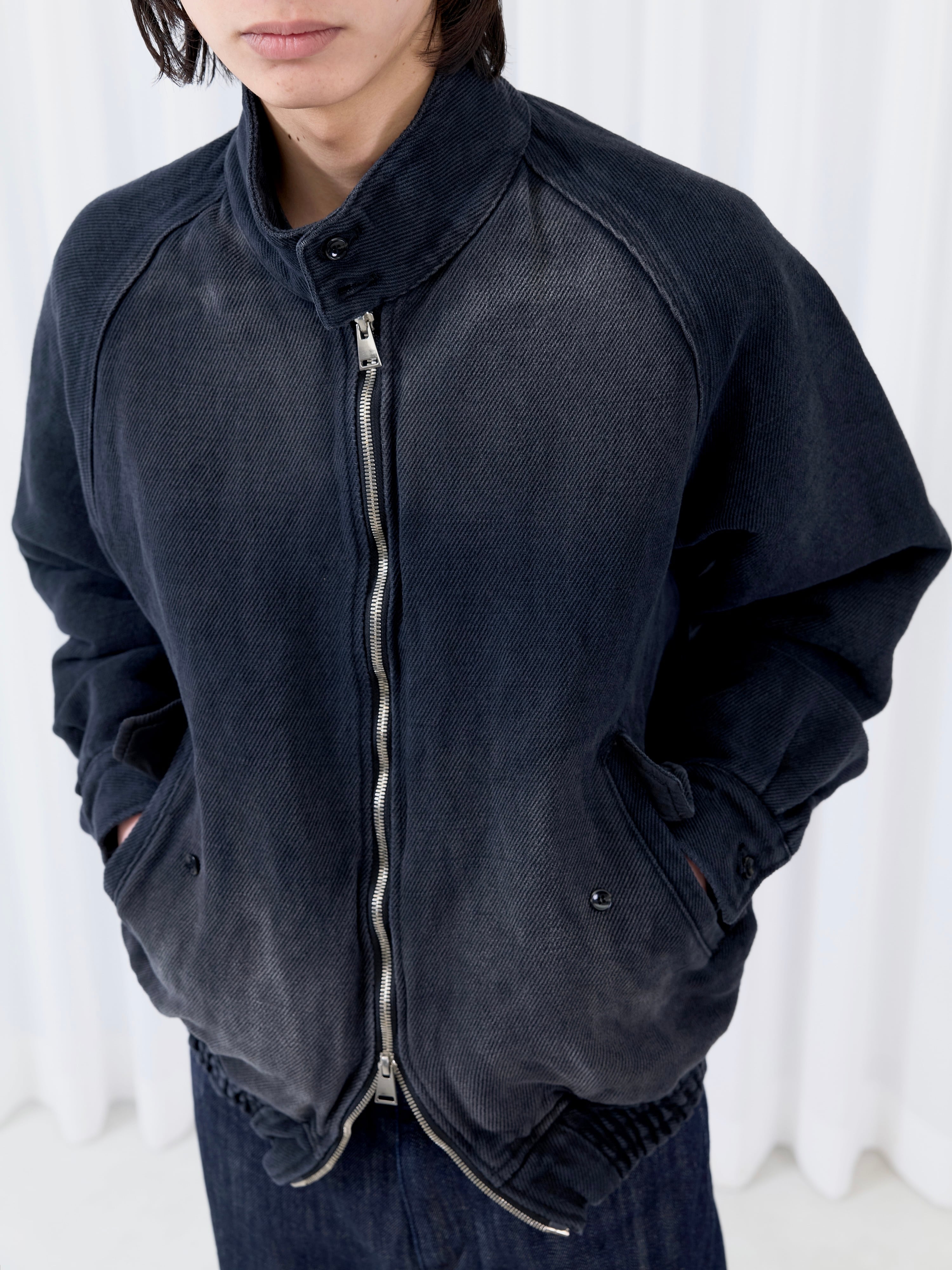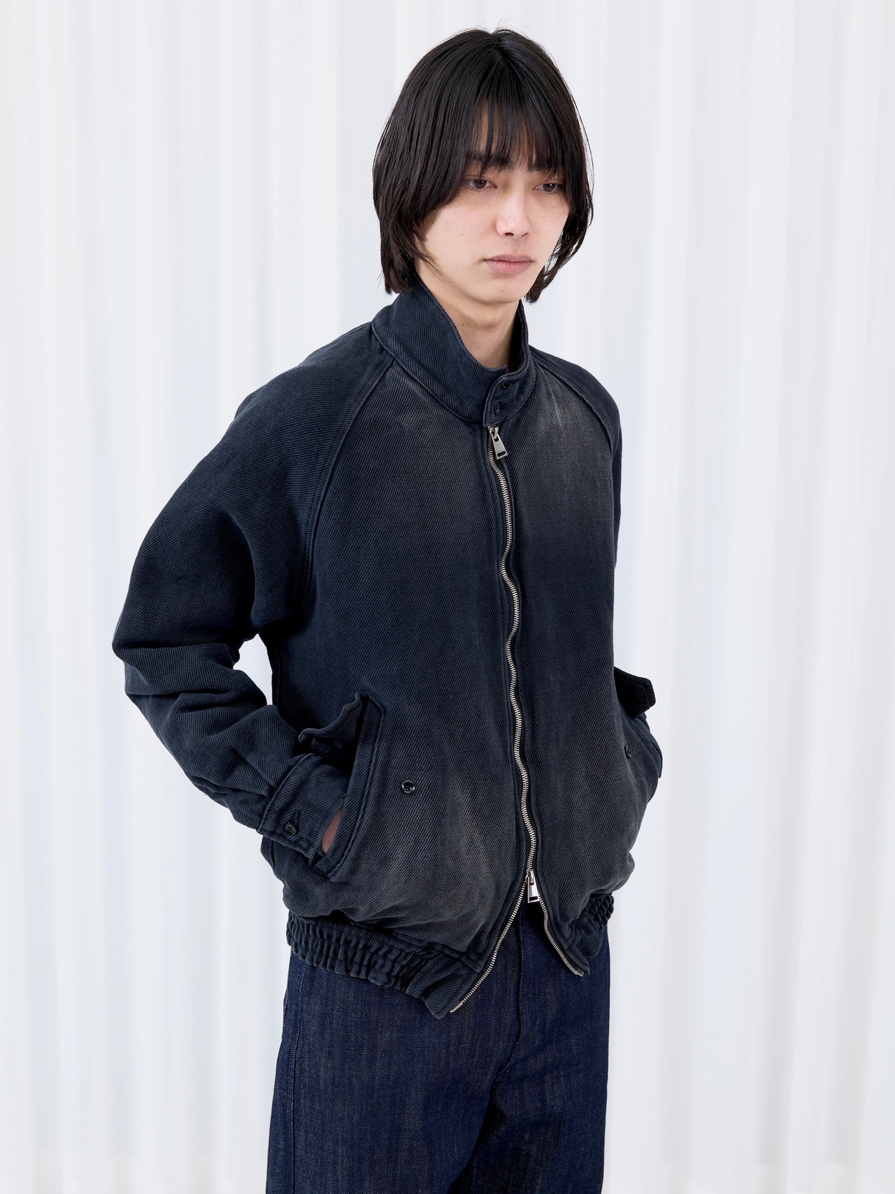 武道着やヘビーデューティーなバッグに使用される地厚な綿麻ヘビーツイルを、ハイネックブルゾンに仕立てました。ブラスト加工、ストーンバイオウォッシュ、そして特殊な柔軟加工を含む一連の丹念な工程を経て、肉厚ながらしなやかで柔軟な素材へと変貌を遂げます。最後に手作業でフェード加工を施すことで、立体的で表情豊かなテクスチャを表現しました。
