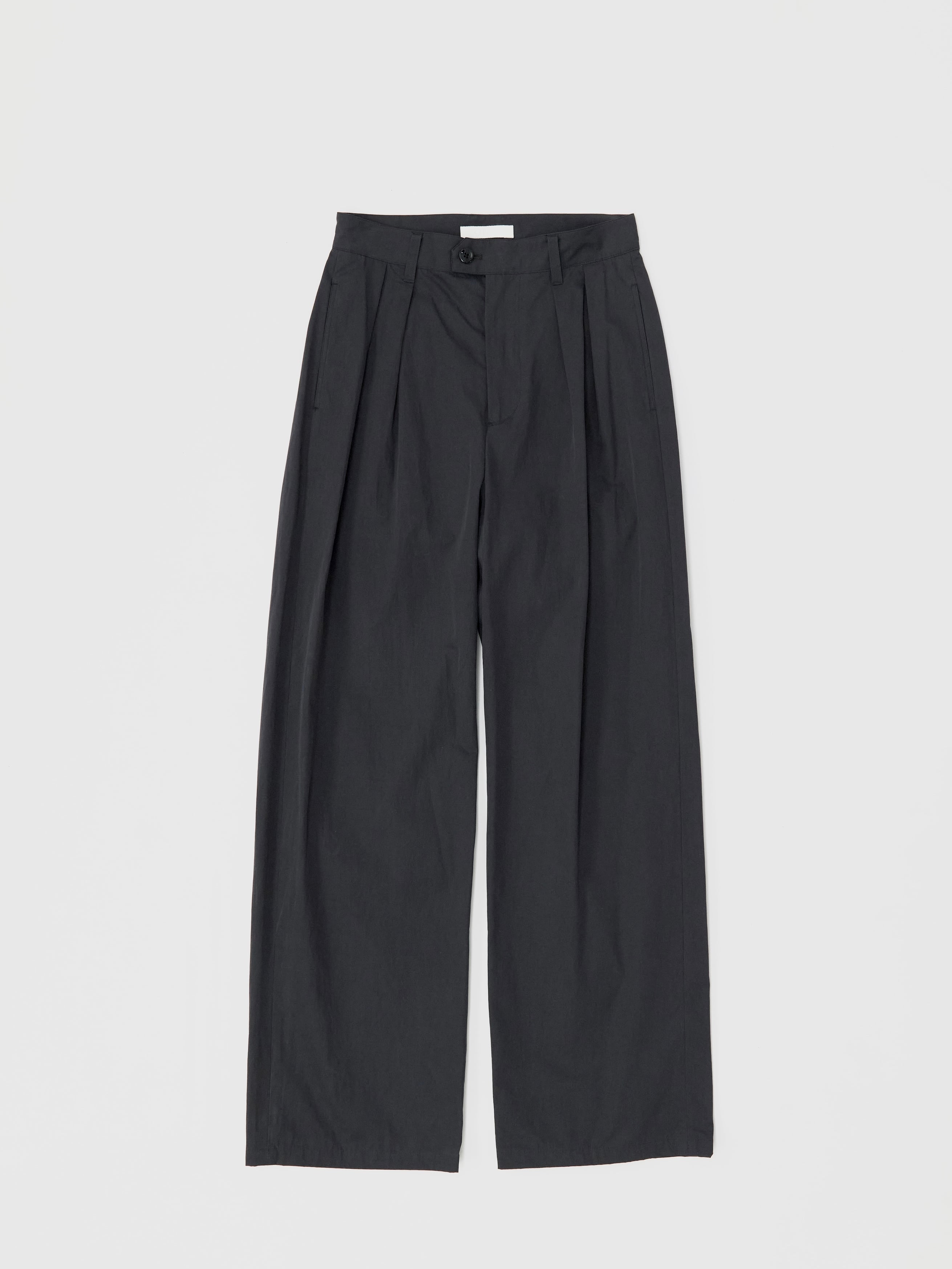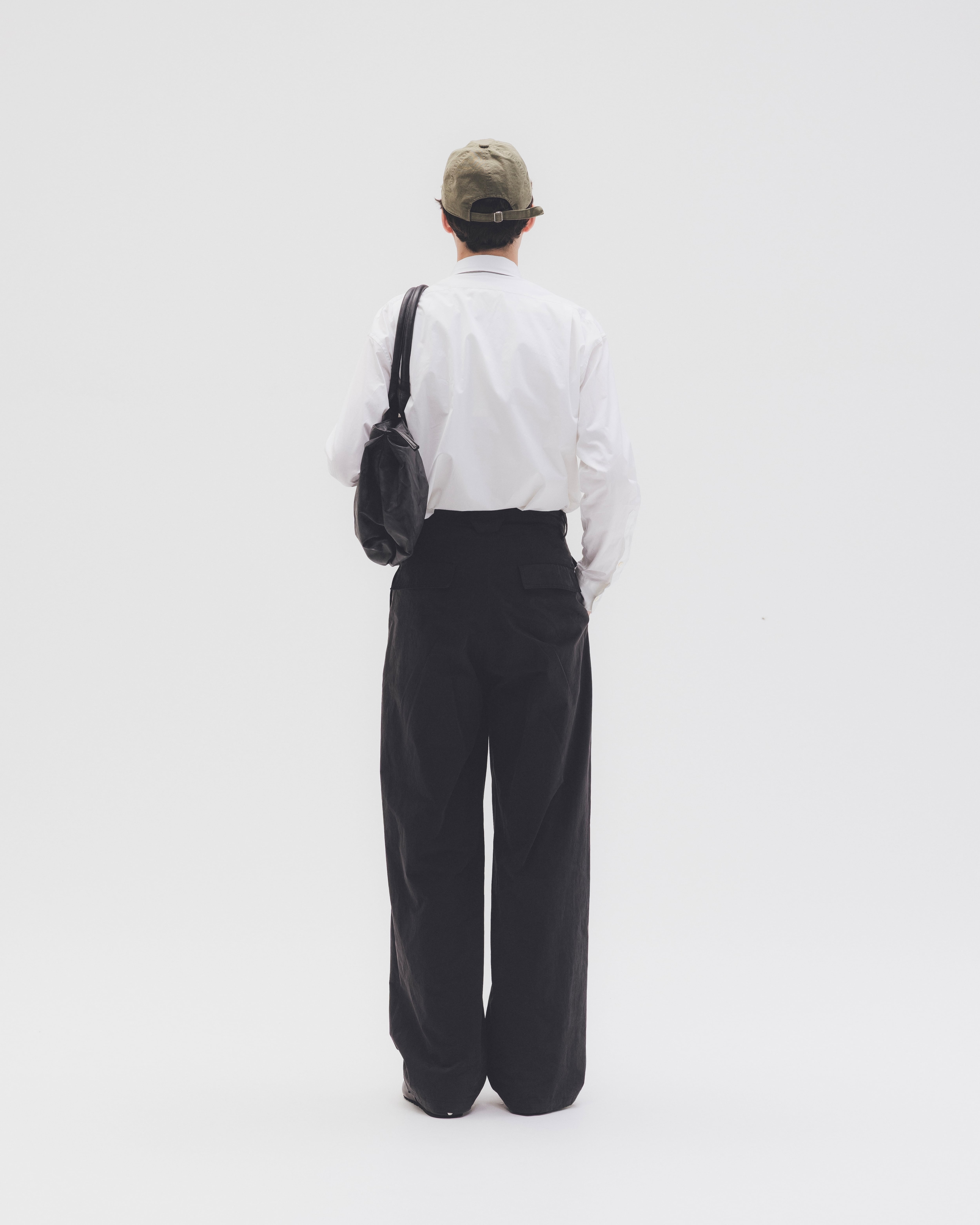 ワイドシルエット、ツータック、六角ベルトループ、フラップバックポケット。