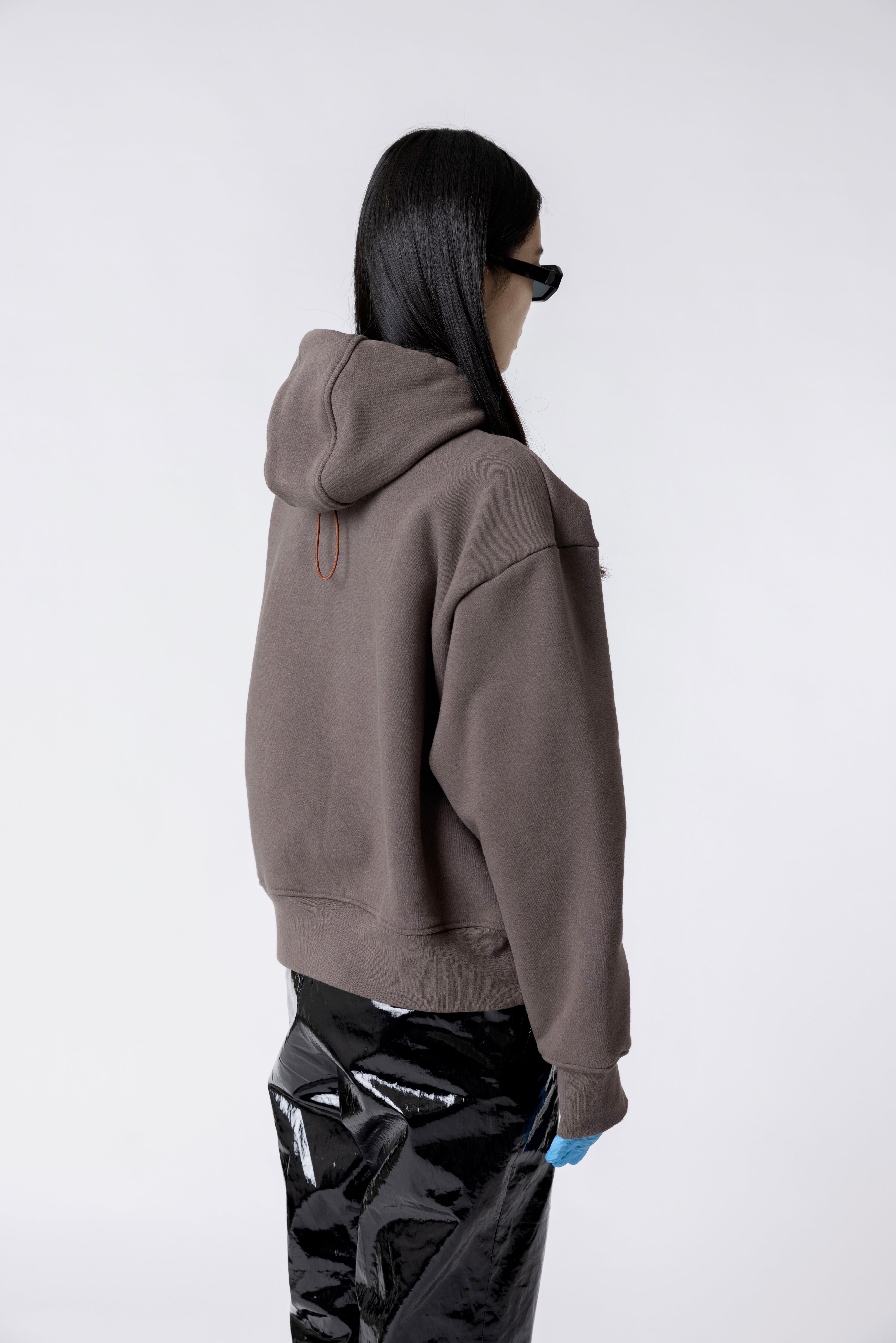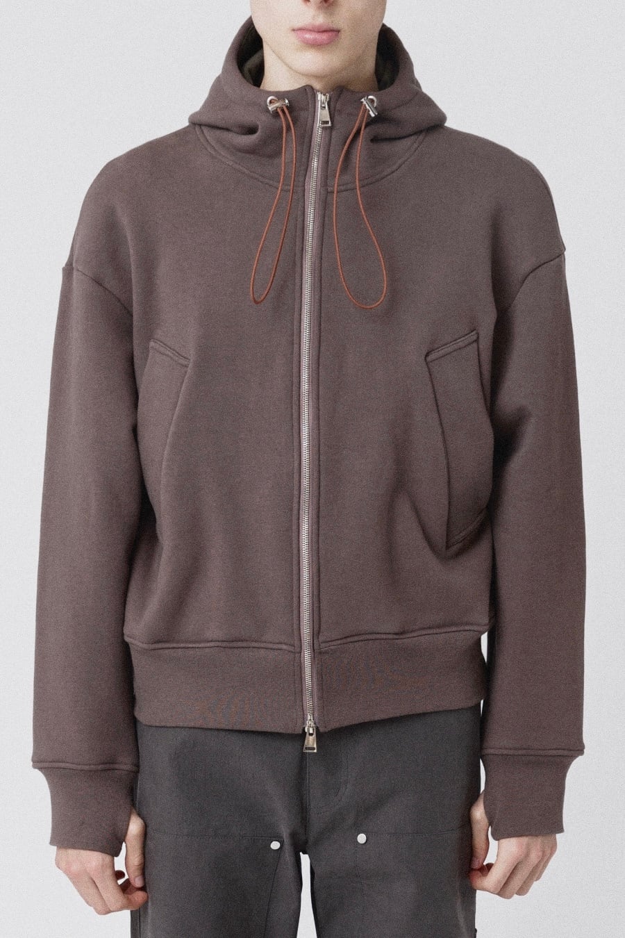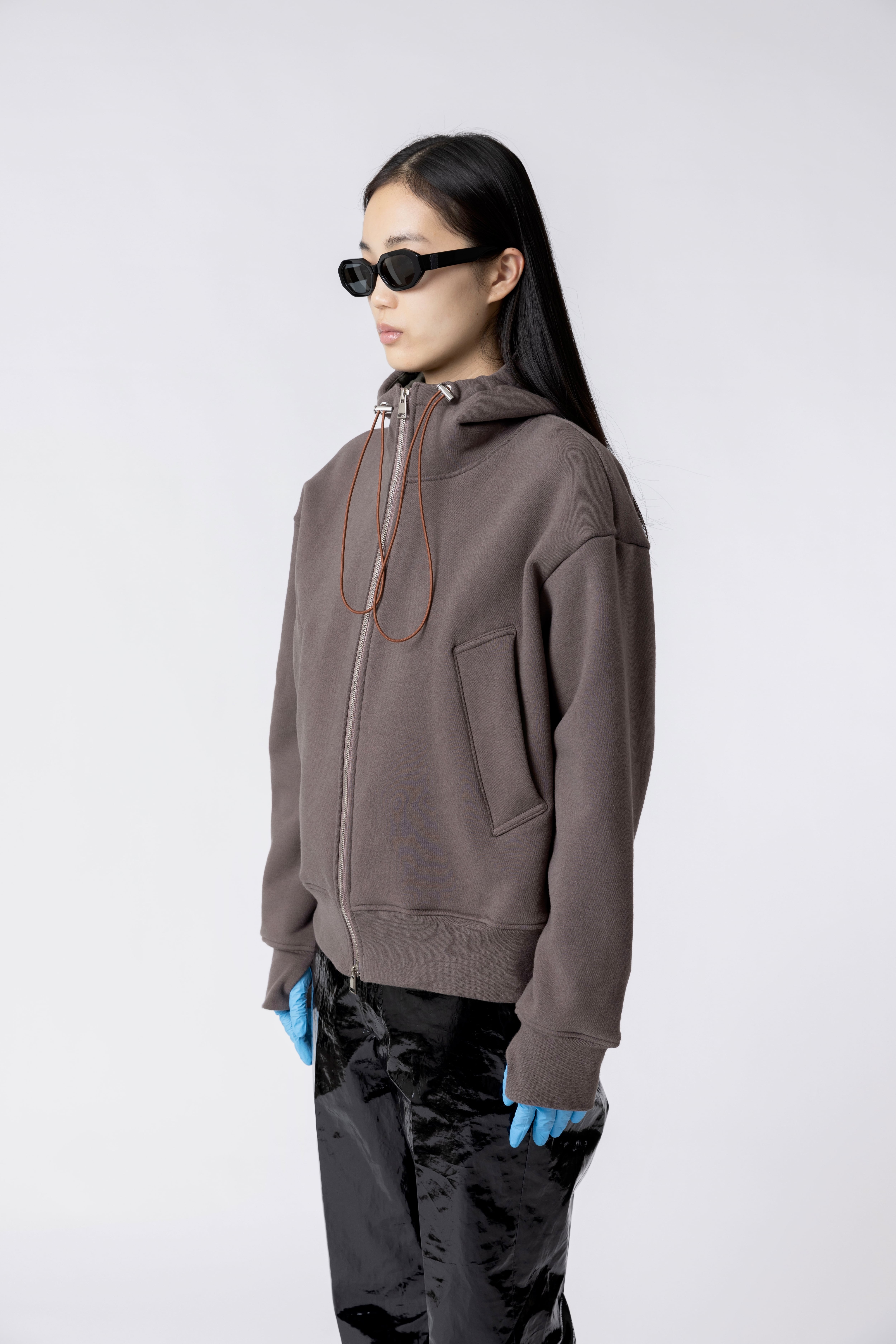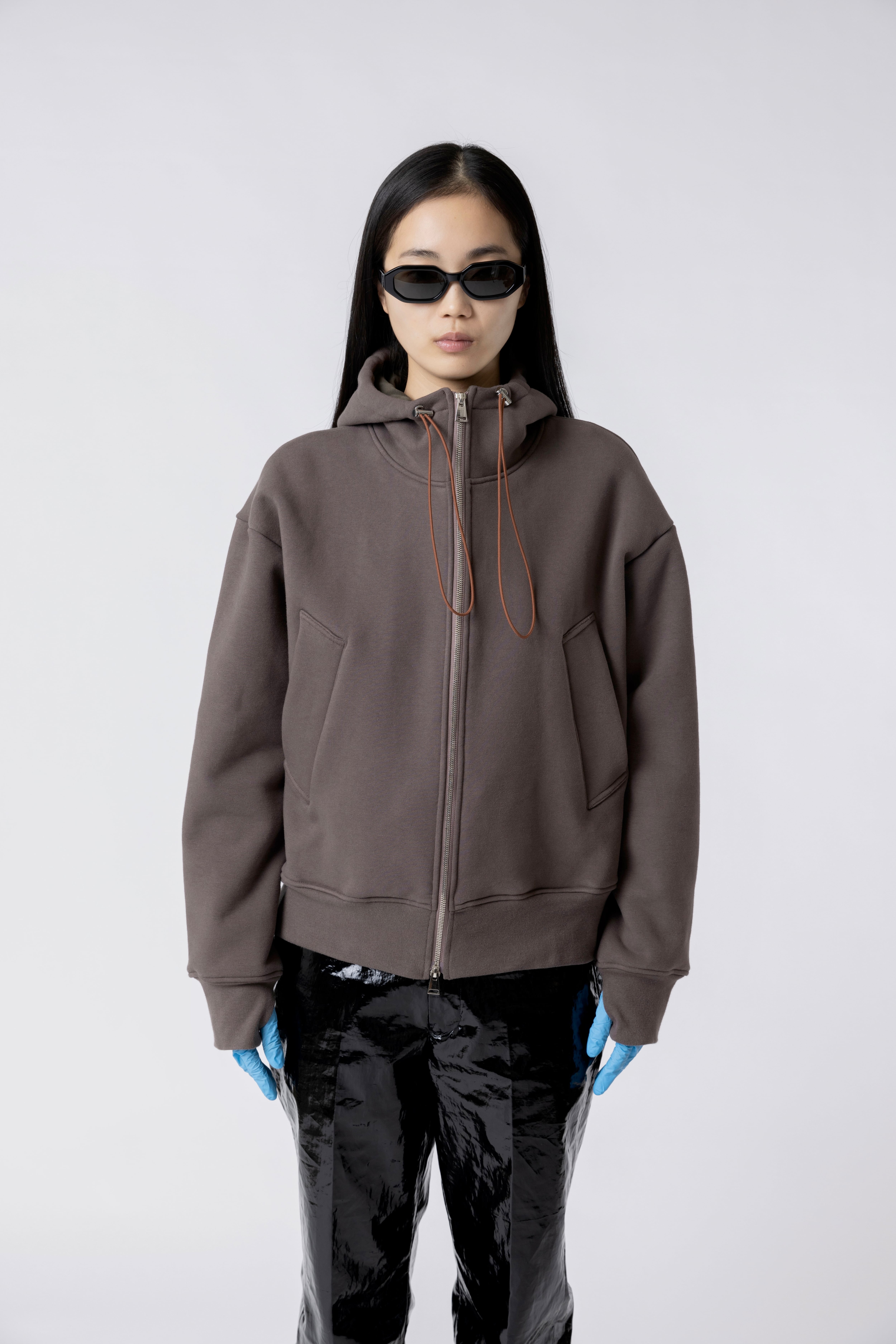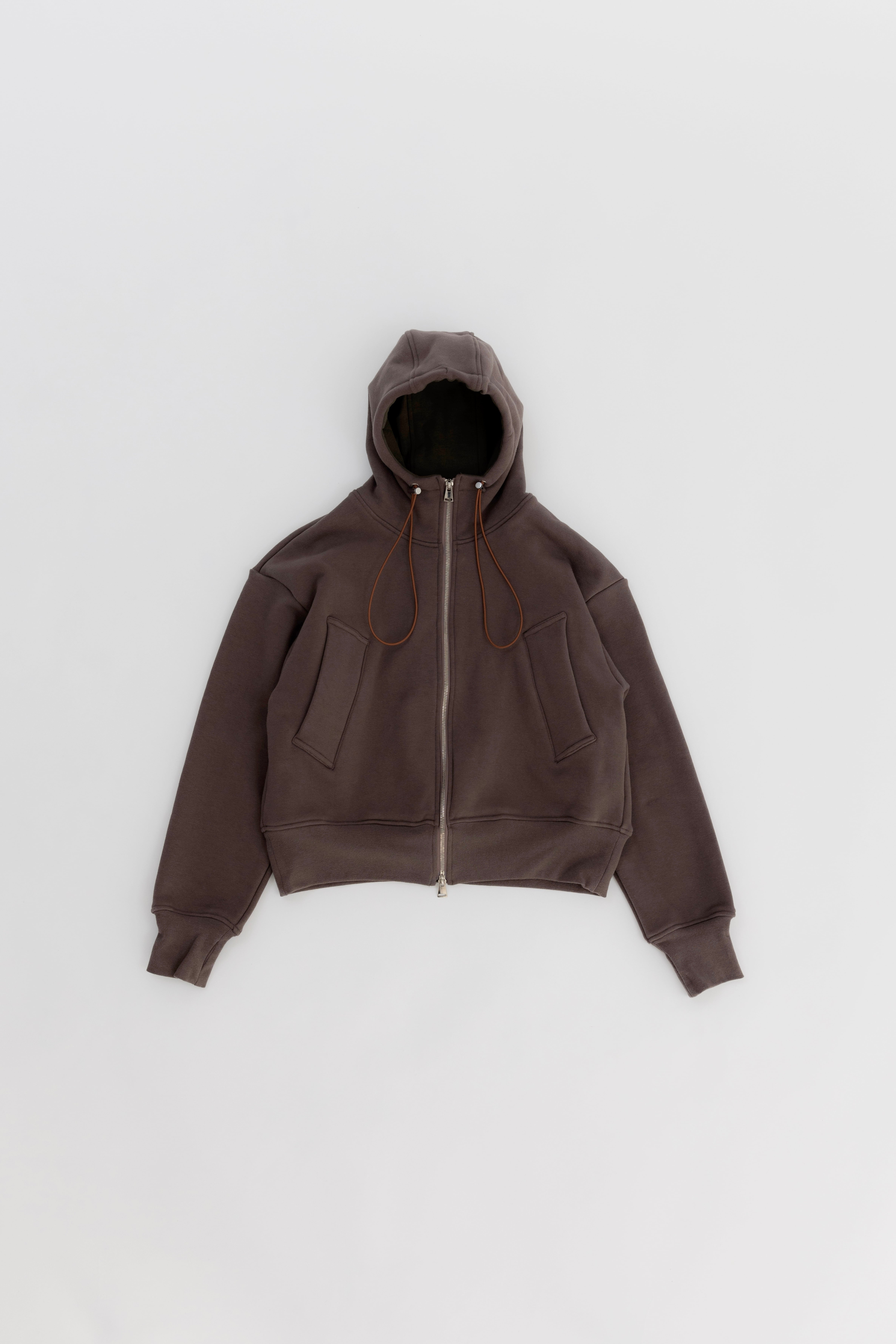 立体的なフーディ、高級感のあるダブルファスナークロージャー、サムホール。